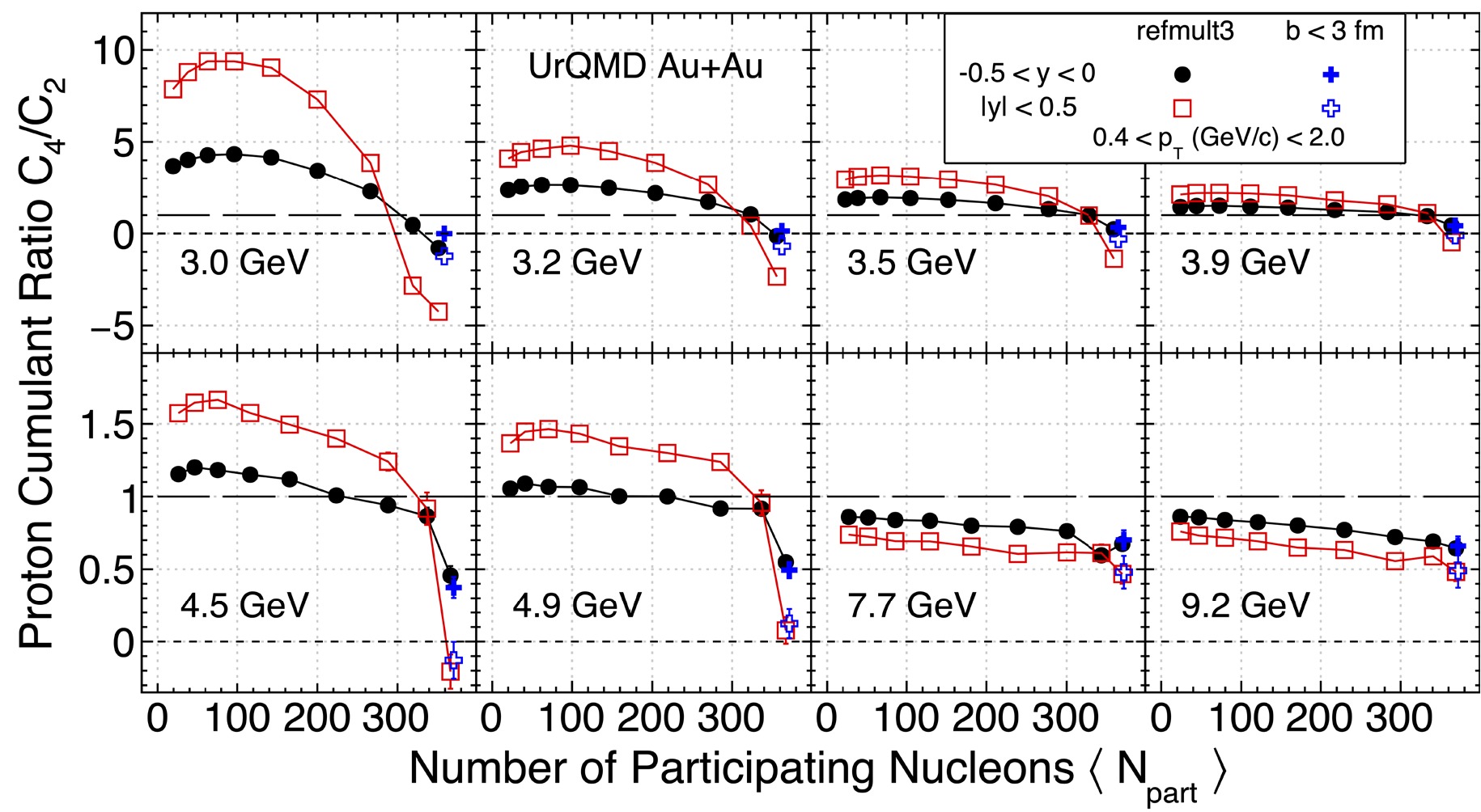 High moments of conserved quantities, such as net-baryon, net-electric charge, and net-strangeness, in heavy-ion collisions are sensitive to fluctuations caused by the quantum chromodynamics critical point (CP). The event-by-event analysis of high moments of the conserved charges has been widely used in experiments to search for the CP, particularly in the RHIC-STAR experiment. To establish a dynamical non-critical baseline, particularly in the high baryon density region, we performed a systematic analysis of the proton multiplicity distributions from Au+Au collisions at\begin{document}$ 3 \leq \sqrt{s_{NN}} \leq 9.2 $\end{document} GeV. The beam energy, centrality, and rapidity width dependence of proton (factorial) cumulants, up to the \begin{document}$ 4^{\rm th} $\end{document} order, were extracted from the calculations of a hadronic transport model called the ultra-relativistic quantum molecular dynamics (UrQMD) model. In addition, the effects of the initial volume fluctuation are discussed. These results will be important for the physics analysis of the RHIC Beam Energy Scan (BES) data, particularly for the fixed-target data and experimental data from future CBM experiments at FAIR.