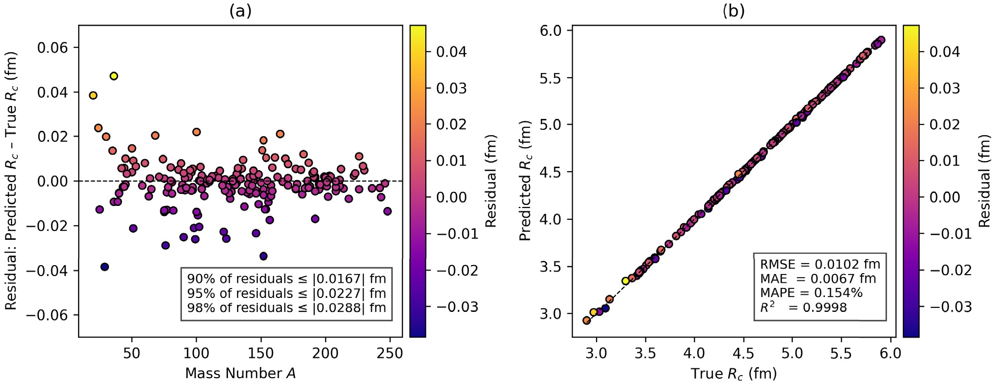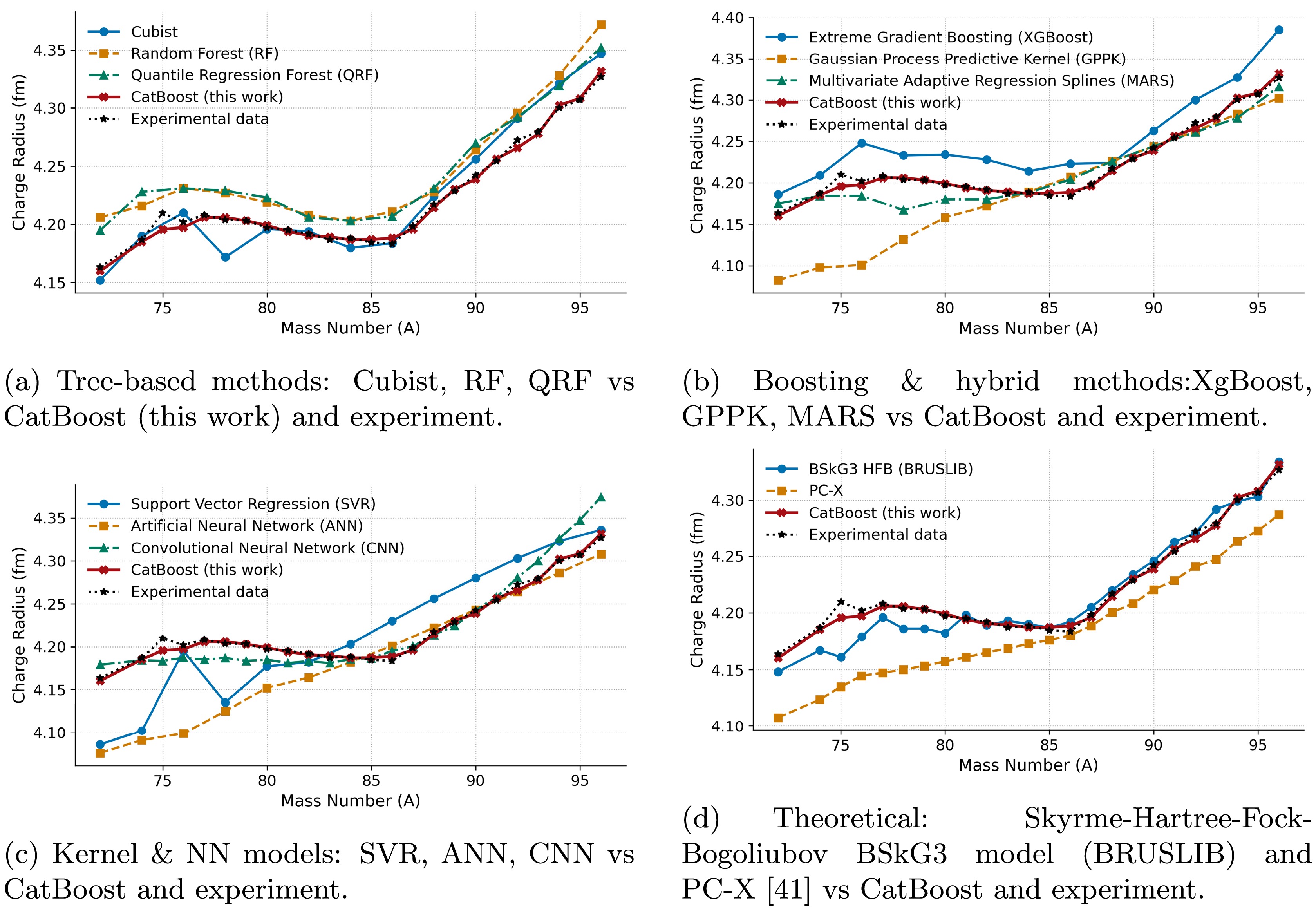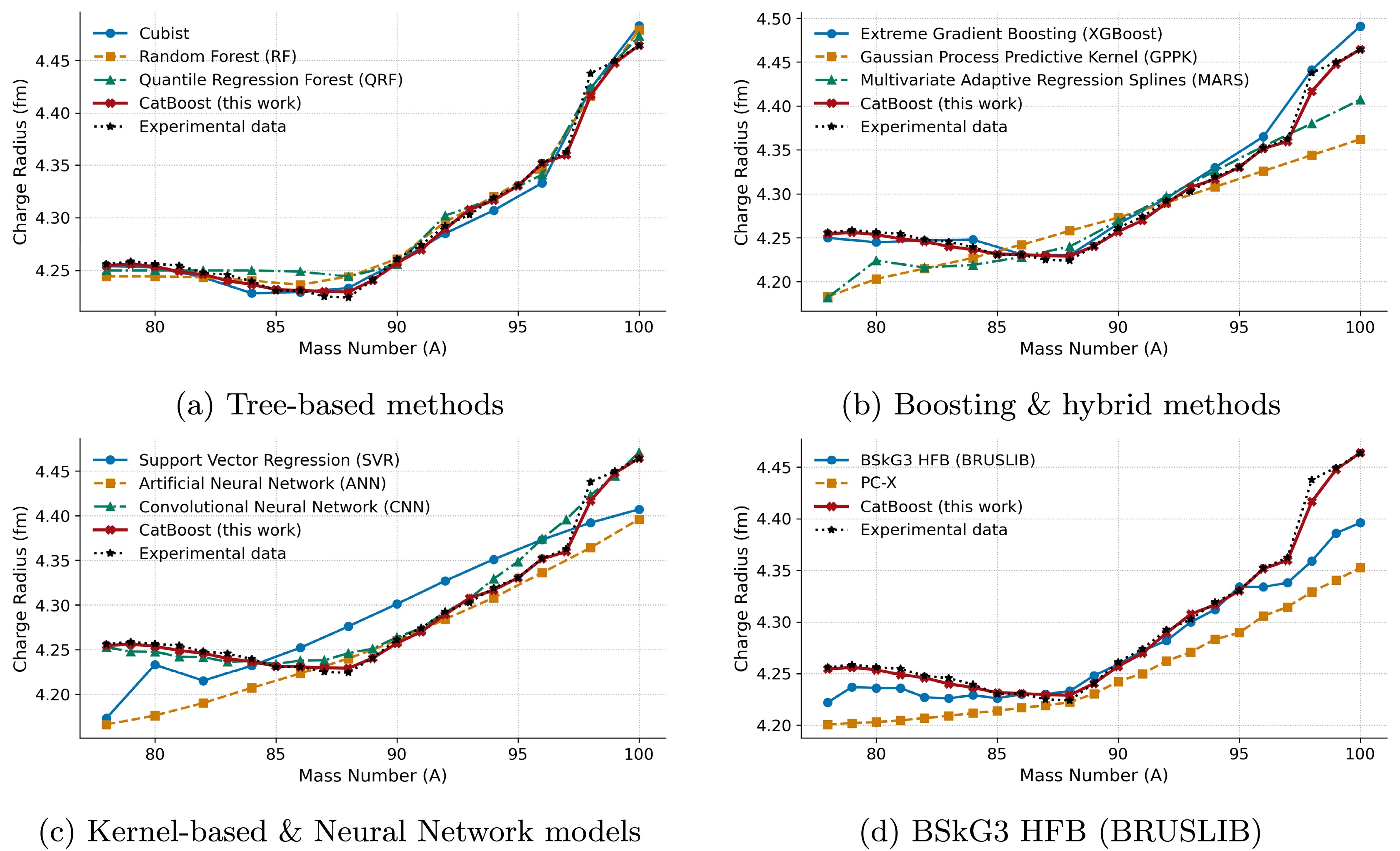 Understanding nuclear shape, behavior, and stability, as well as improving nuclear models, depends on the precise determination of ground-state nuclear charge radii. Existing experimental techniques are limited to extremely narrow regions of the nuclear chart; theoretical models, including relativistic Hartree-Bogoliubov (RHB) and Hartree-Fock-Bogoliubov (HFB), predict broad trends of nuclear properties but miss fine isotopic features such as odd-even staggering effects and shell-closure kinks. High computational time and cost are other obstacles to theoretical approaches. Although machine-learning algorithms have made significant progress in predicting charge radii, they are still hindered by a lack of balanced data and characteristics, primarily centered around\begin{document}$ A\ge40 $\end{document} and \begin{document}$ Z\ge20 $\end{document} . In the present study, we present the first application of CatBoost regression to compute nuclear charge radii. We integrated two experimental datasets with RHB-calculated point-coupling interaction (PC-X) theoretical features and extended our study range to \begin{document}$ A\ge17 $\end{document} , \begin{document}$ Z\ge8 $\end{document} . We found the best hyperparameters using Optuna’s Tree-structured Parzen Estimator (TPE) sampler with 10-fold cross-validation (CV), achieving a CV root-mean-square error (RMSE) of 0.0106 fm and hold-out RMSE of 0.0102 fm, with only three features, i.e., neutron number (N), proton number (Z), and RHB theoretical binding energy (BE), outperforming nine other ML models: random forest (RF), quantile RF (QRF), Cubist, Gaussian process regression with polynomial kernel (GPPK), multivariate adaptive regression splines (MARS), SVR, ANN, convolutional neural network (CNN), and Brussels-Skyrme-on-a-grid 3 (BSkG3). SHapley Additive exPlanations (SHAP) analysis confirms the highest global influence of BE in the model's predictions, followed by proton number and neutron number. The proposed model can accurately reproduce the \begin{document}$ N=50 $\end{document} kink and odd-even staggering effects in krypton and strontium chains. These results establish CatBoost as a robust and notably promising model for charge-radius prediction and beyond, with the potential to impact r-process modeling and future theoretical development.