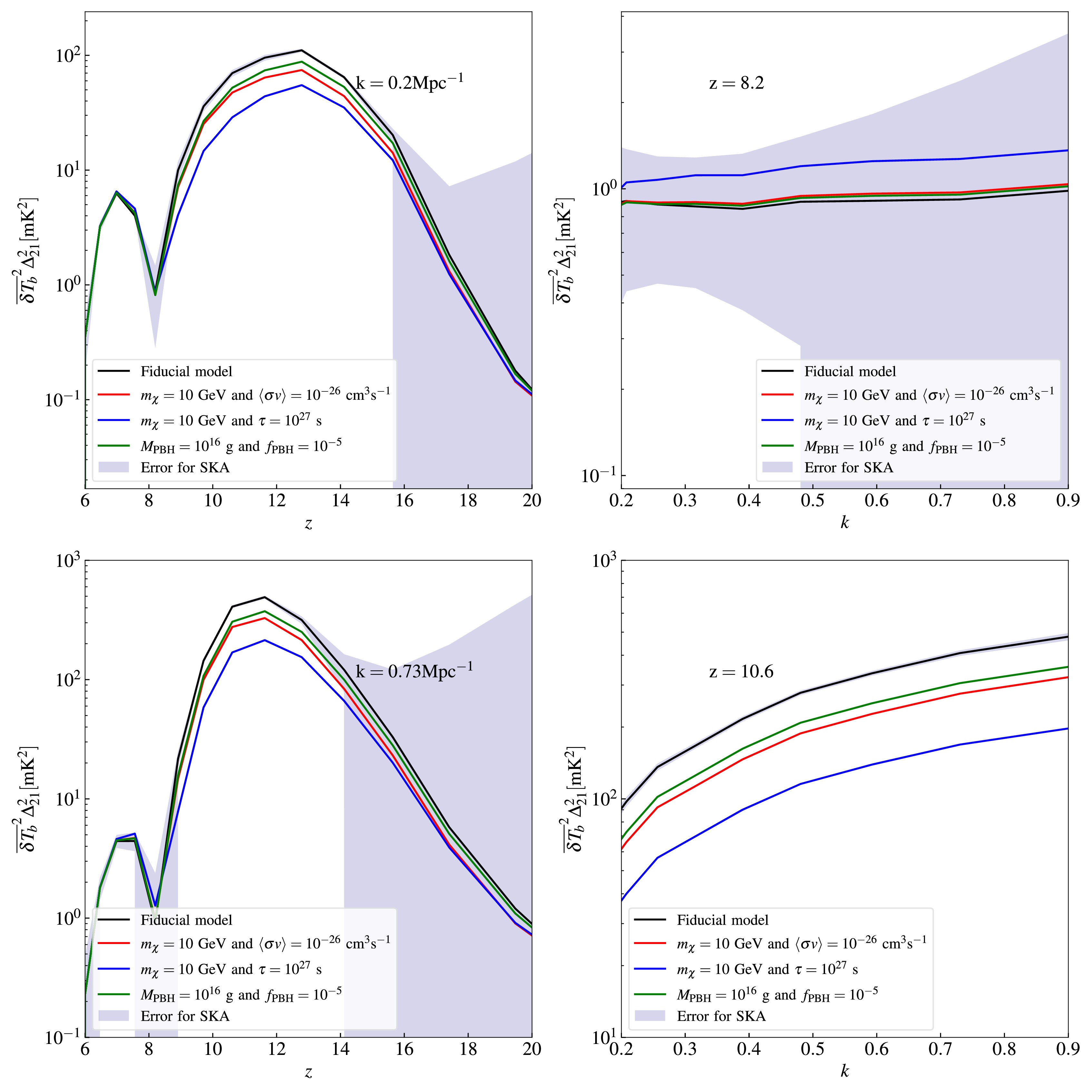 Probing the nature of dark matter (DM) remains an outstanding problem in modern cosmology. The 21 cm signal, a sensitive tracer of neutral hydrogen during the cosmic dawn, provides a unique means to investigate DM nature during this critical epoch. The annihilation and decay of DM particles, as well as Hawking radiation of primordial black holes (PBHs), can modify the thermal and ionization histories of the early universe, leaving distinctive imprints on the 21 cm power spectrum. Therefore, the redshifted 21 cm power spectrum serves as an effective tool for investigating such DM processes. In this work, we systematically assess the potential of the upcoming Square Kilometre Array (SKA) to constrain DM and PBH parameters using the 21 cm power spectrum. Assuming 10,000 h of integration time, the SKA is projected to reach sensitivities of\begin{document}$ \langle\sigma v\rangle \leq 10^{-28}\,{{\rm{cm}}}^{3}\,{{\rm{s}}}^{-1} $\end{document} and \begin{document}$ \tau\ge10^{28}\, \rm{s} $\end{document} for \begin{document}$ 10\; {{\rm{GeV}}} $\end{document} DM particles. It can also probe PBHs with masses of \begin{document}$ 10^{16}\,{{\rm{g}}} $\end{document} and abundances of \begin{document}$ f_{{{\rm{PBH}}}} \leq 10^{-6} $\end{document} . These results indicate that the SKA can place constraints on DM annihilation, decay, and PBH Hawking radiation that are up to two to three orders of magnitude stronger than current limits. Furthermore, the SKA is expected to exceed existing bounds on sub-GeV DM and probe Hawking radiation from PBHs with masses above \begin{document}$ 10^{17}\,{{\rm{g}}} $\end{document} , which are otherwise inaccessible using conventional cosmological probes. Overall, the SKA holds significant promise for advancing our understanding of both DM particles and PBHs, potentially offering new insights into the fundamental nature of DM.