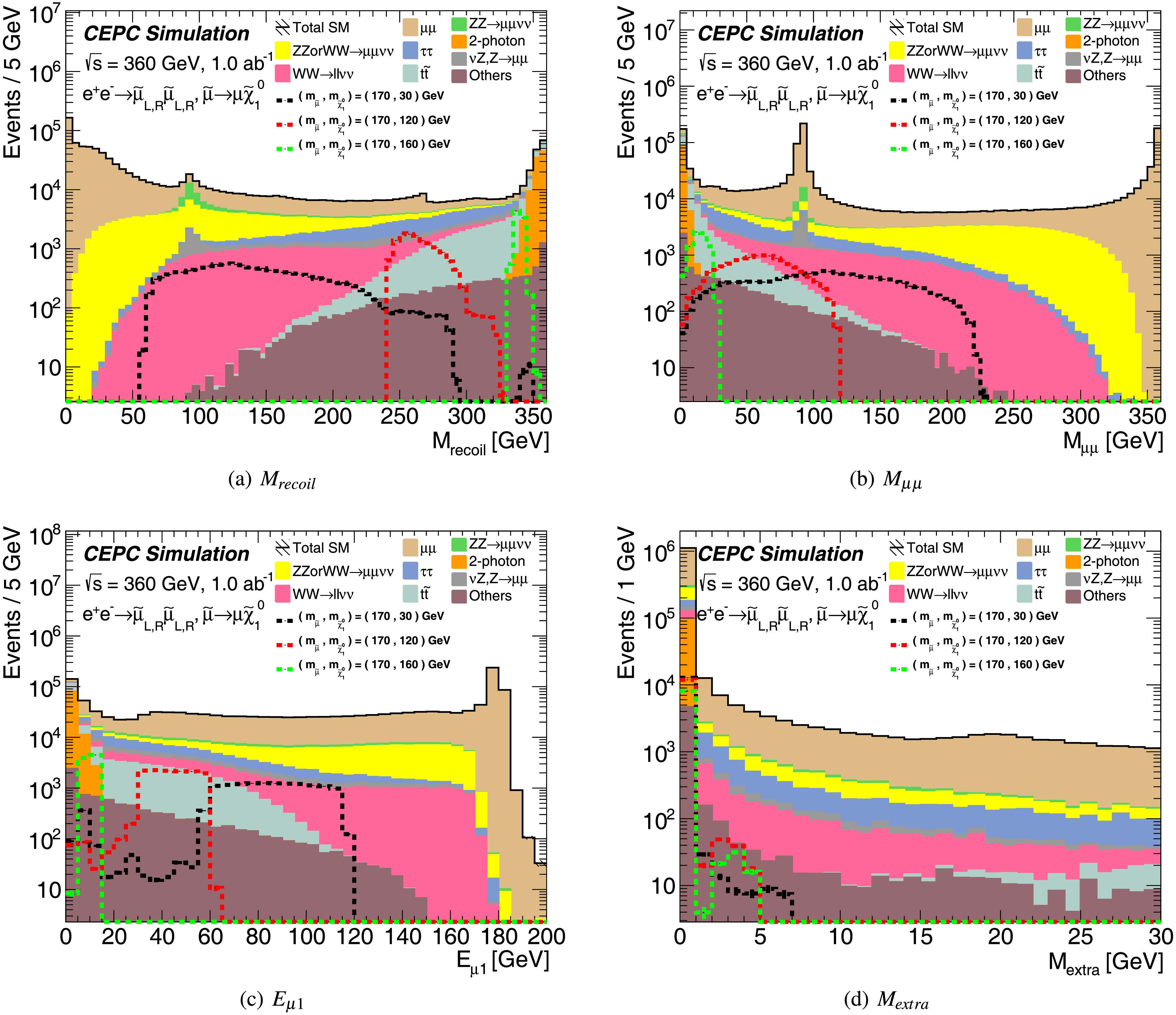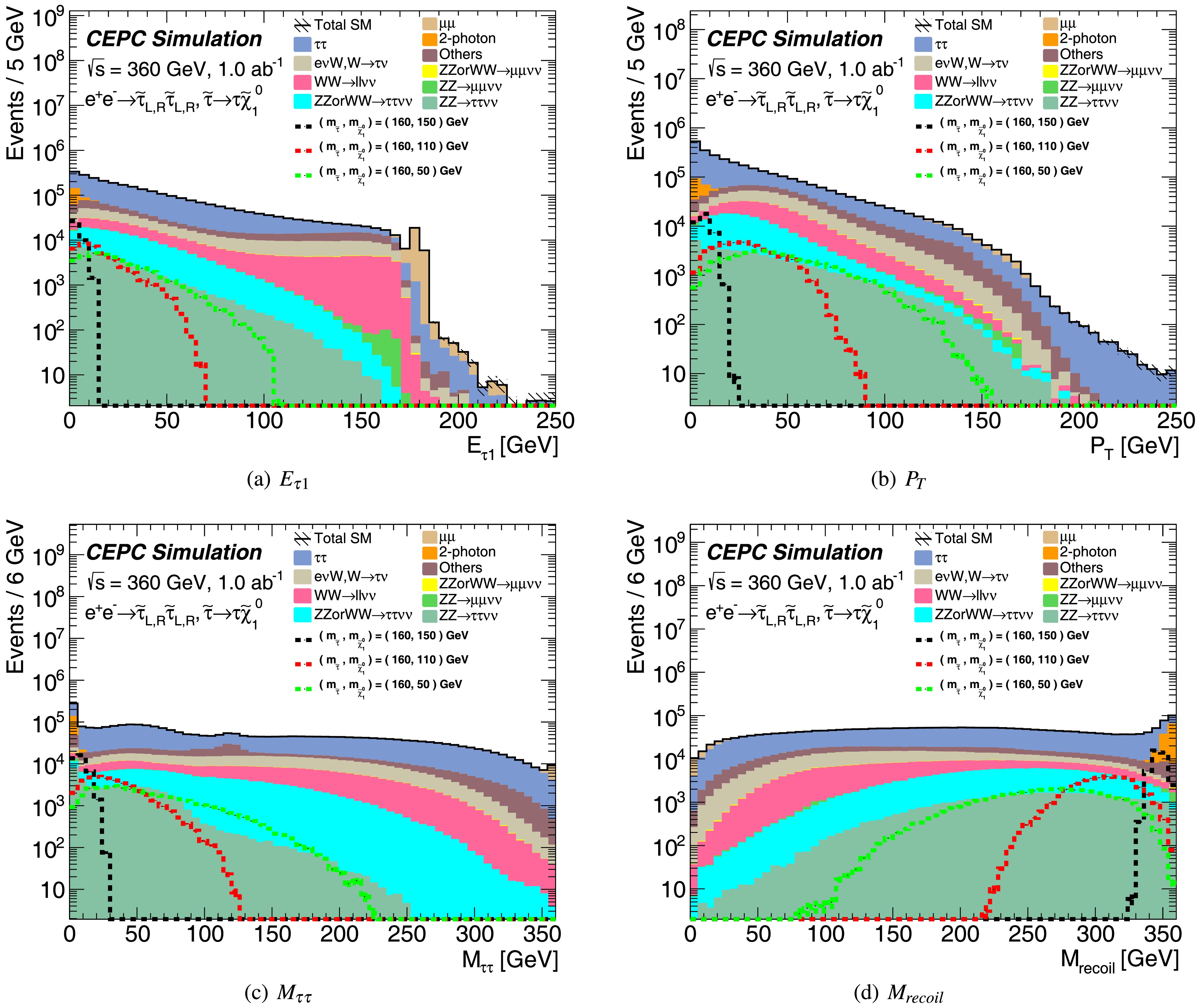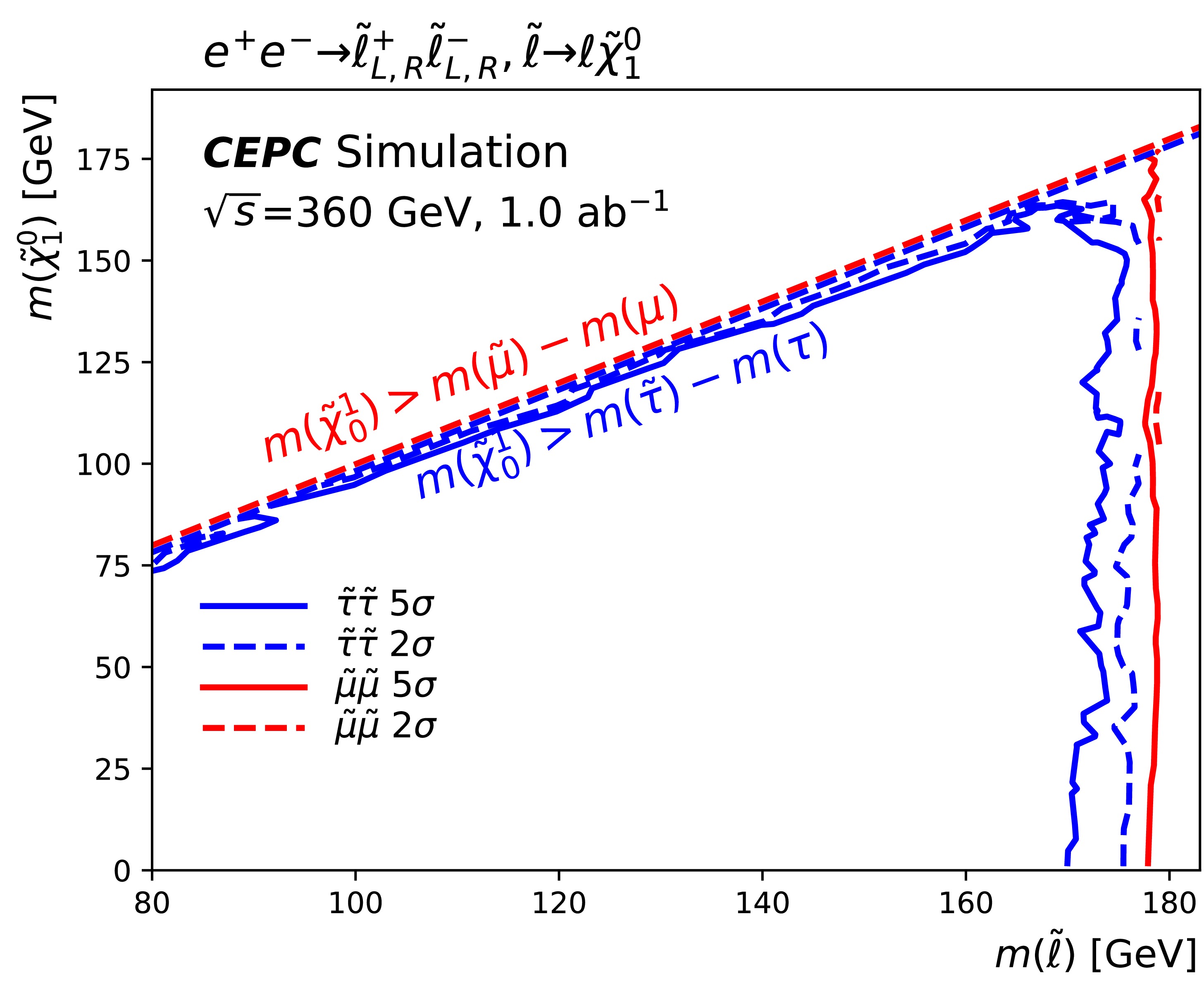 The Circular Electron Positron Collider (CEPC) is designed to operate at key center-of-mass energies: 91.2 GeV as a Z factory for precision Z boson studies, ≈ 160 GeV at the threshold for W boson pair production, and 240 GeV as a Higgs factory for copious Higgs boson production. It can be upgraded to 360 GeV (CEPC-360 GeV) for enabling top quark-antiquark (\begin{document}$ t\bar{t}$\end{document} ) pair production. Beyond enabling high-precision measurements of the Standard Model (SM), CEPC-360 GeV is uniquely positioned to perform searches for new physics beyond the SM (BSM), serving as a valuable complement to hadron colliders. This paper presents a sensitivity study on the direct pair production of staus and smuons at the CEPC with \begin{document}$ \sqrt{s}$\end{document} = 360 GeV, conducted via full Monte Carlo simulation. Under the assumptions of 1.0 ab−1 integrated luminosity and a flat 5% systematic uncertainty, CEPC-360 GeV could potentially discover the combined production of left-handed and right-handed staus up to a mass of 170 GeV (if they exist) or up to 169 for pure left-handed staus and 162 GeV for pure right-handed staus. For direct smuon production, the discovery potential reaches up to 178 GeV under the same conditions.