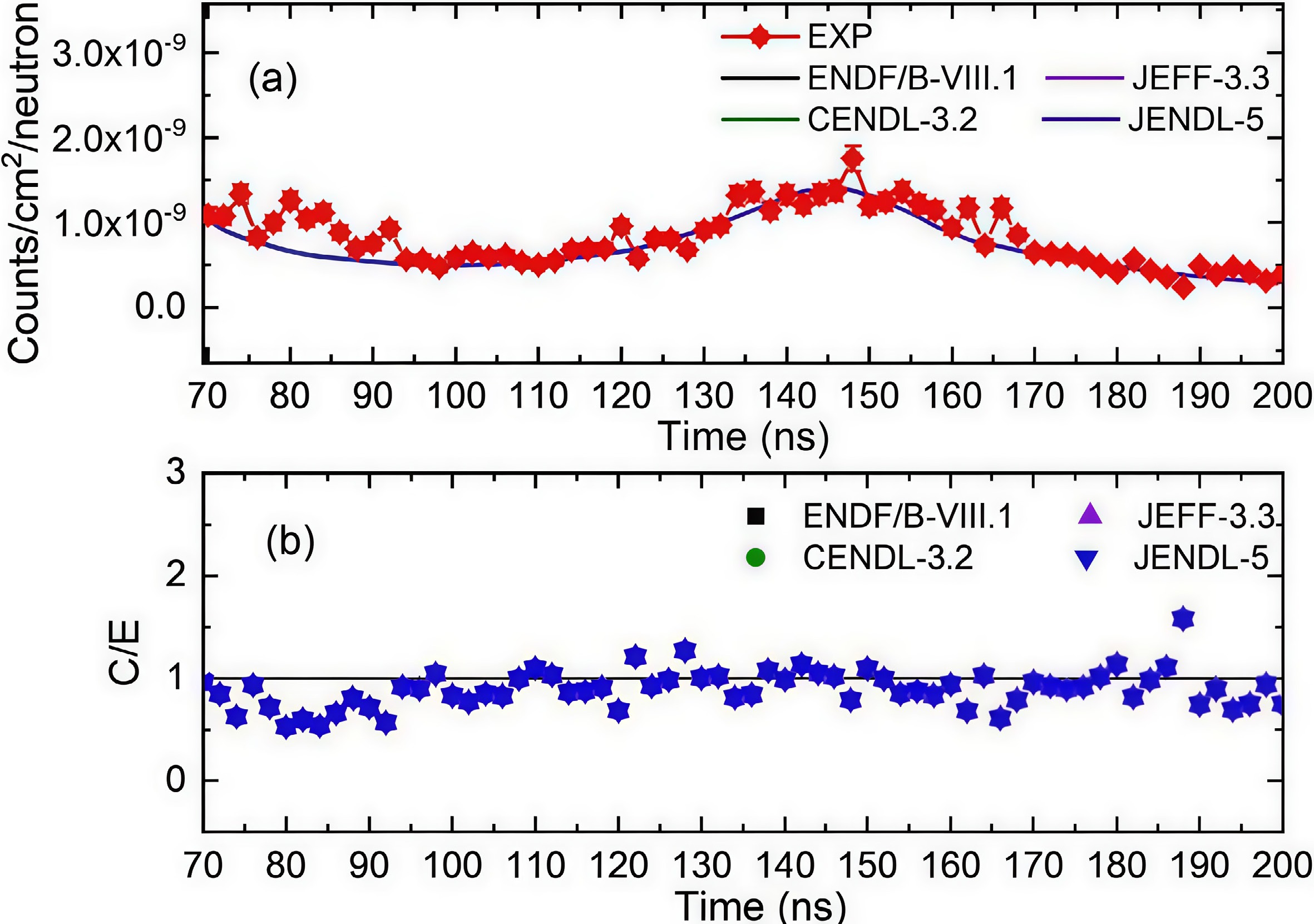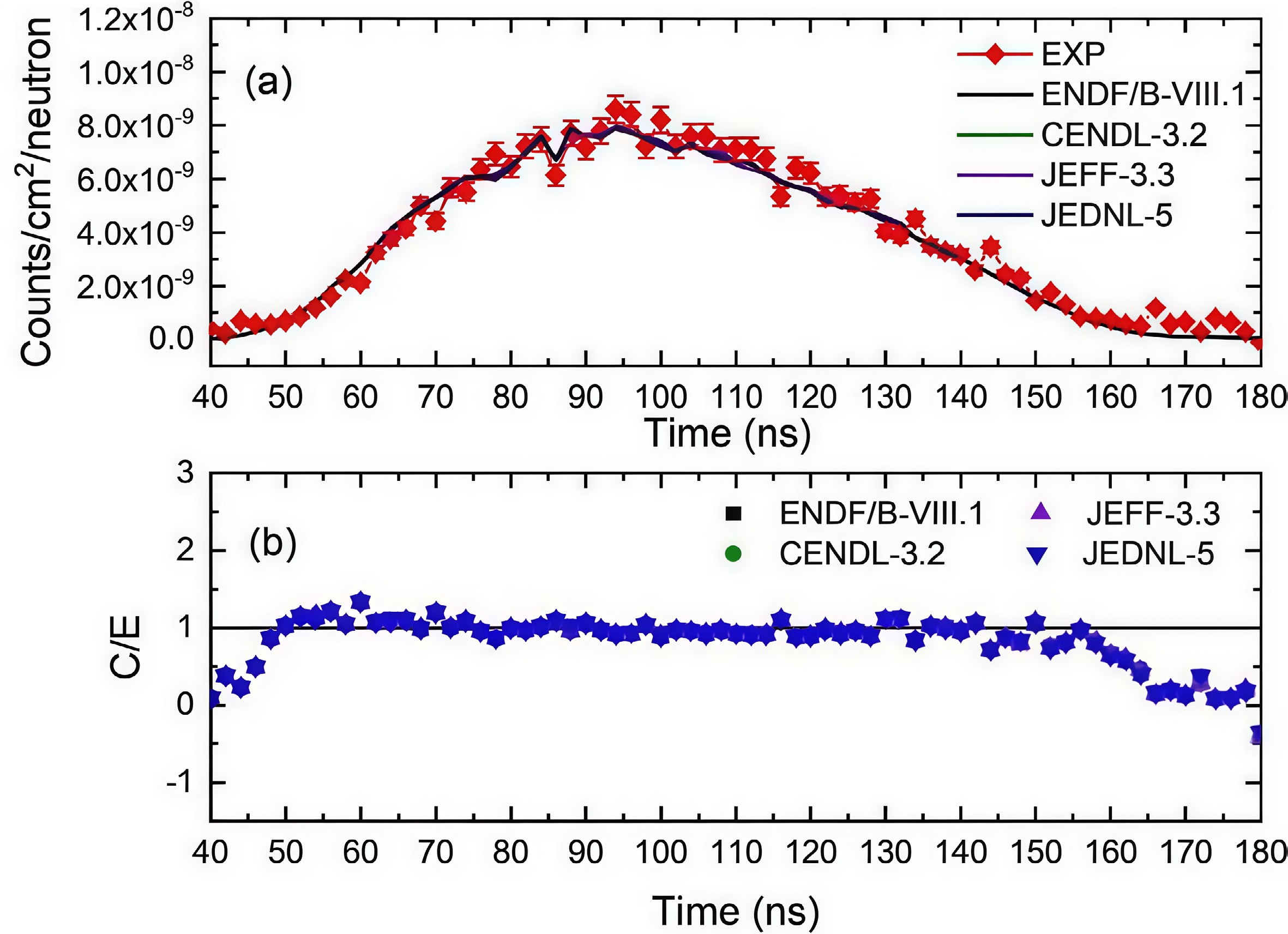 This paper presents the development and validation of China’s first benchmark measurement system for neutron leakage time-of-flight (TOF) spectra using a 252Cf spontaneous fission source and spherical polyethylene sample. EJ-309 and CLYC scintillation detectors were used for neutron detection, and a shadow cone was employed for background suppression. Notably, the SiC detector was, for the first time on this platform, applied as the start-time signal generator in TOF spectrum measurement. The TOF spectrum covering the energy range of 0.15−8.00 MeV was measured, and the results were systematically compared with evaluated data from four major nuclear libraries: ENDF/B-VIII.1, JEFF-3.3, JENDL-5, and CENDL-3.2. The comparison revealed strong agreement across the full spectrum, with calculated to experimental (C/E) deviations remaining within 5% in the high-energy region and within 13% at low energies. These results verify the system’s stability and suitability for integral experiments. The established benchmark platform provides a strong technical foundation for future neutron nuclear data validation, particularly in shielding applications and the improvement of fission-spectrum nuclear databases.
