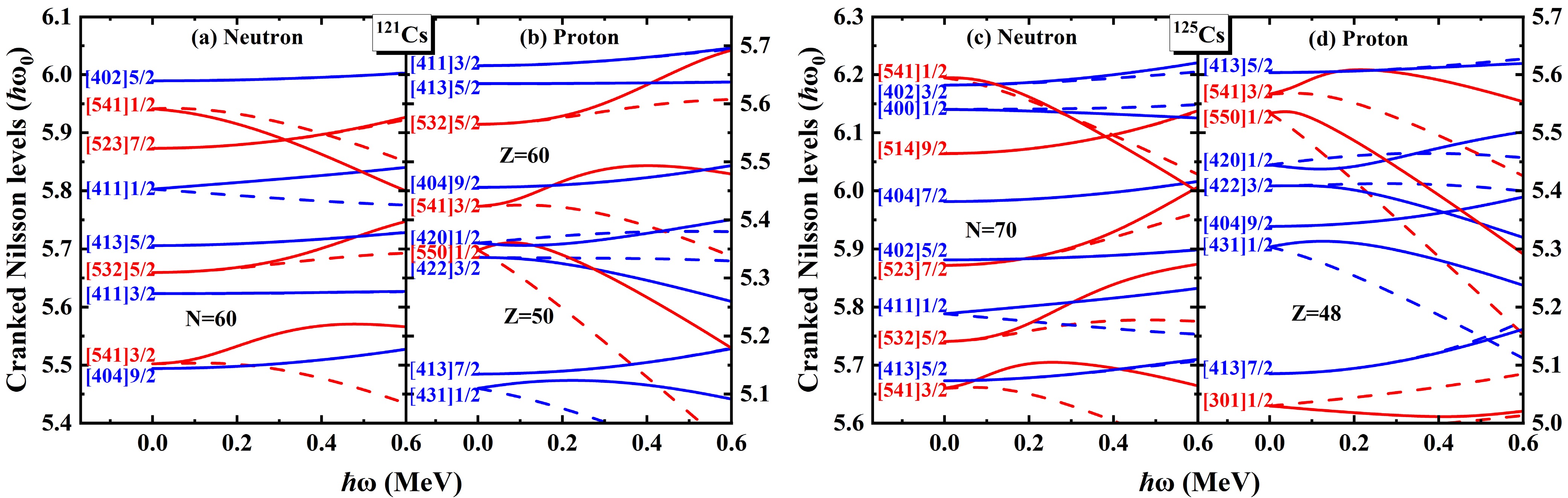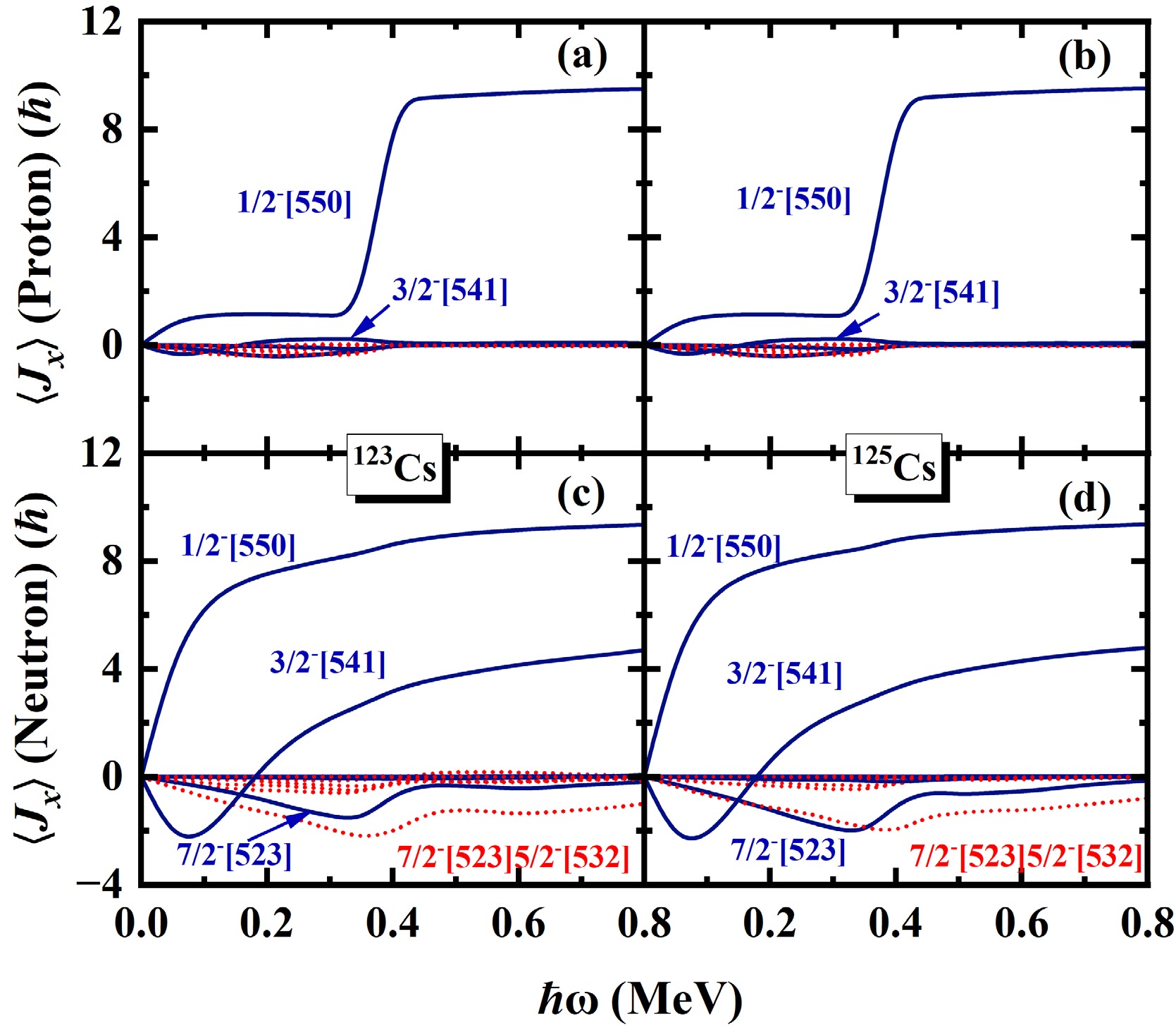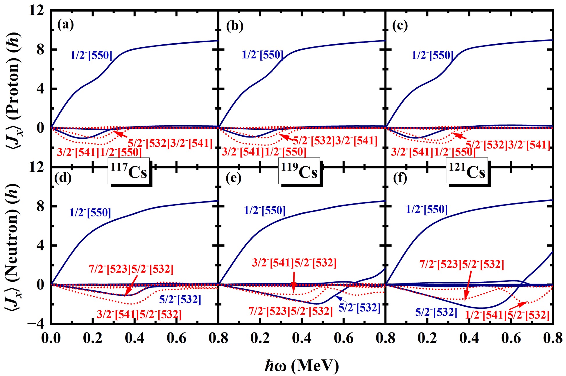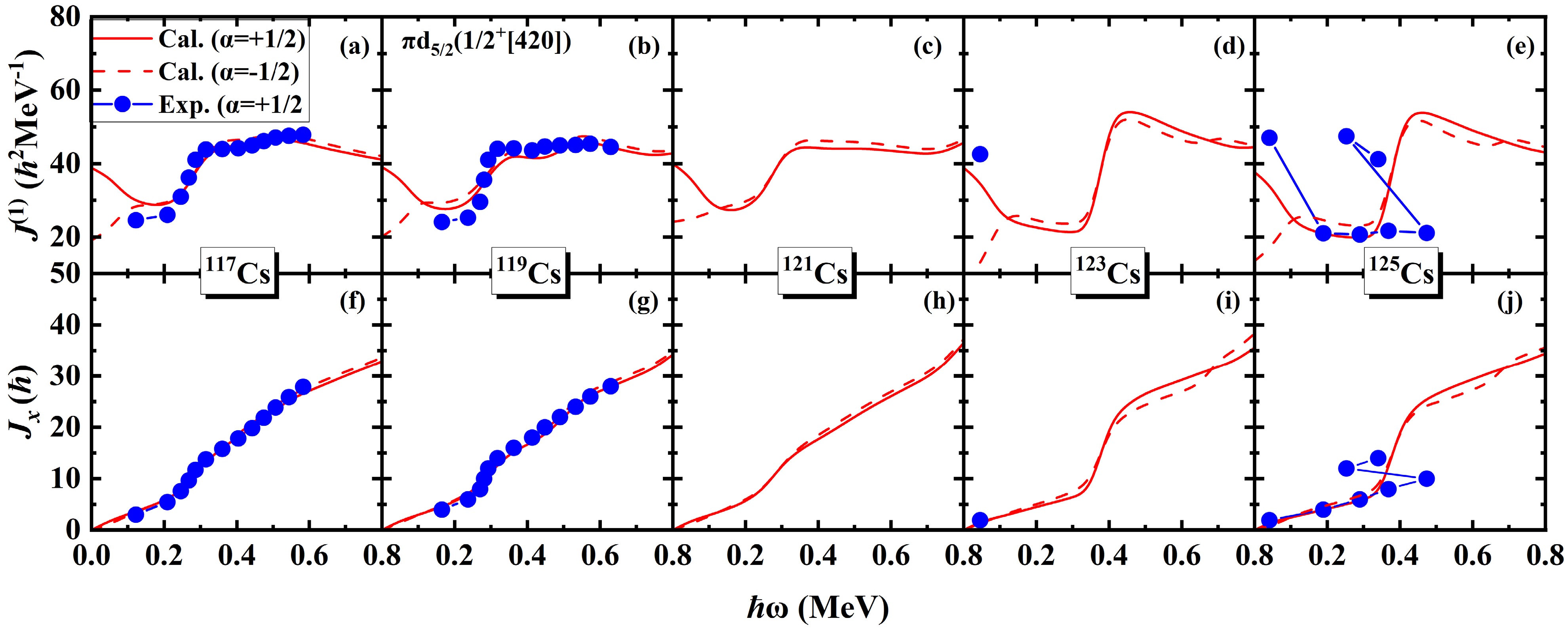 The\begin{document}$ \pi d_{5/2} $\end{document} rotational bands in odd-even nuclei 117,119,121,123,125Cs are systematically investigated using the cranked shell model (CSM) with the pairing correlations modeled with a particle number conserving (PNC) method. In this PNC method, the particle number is conserved exactly while considering the blocking effects. The experimental observations of the \begin{document}$ \pi d_{5/2} $\end{document} bands with two upbendings for 117,119Cs and one backbending for 125Cs are reproduced very well by the PNC-CSM method. Furthermore, \begin{document}$ \pi d_{5/2} $\end{document} configuration bands with two upbendings for 121Cs and one backbending for 123Cs are predicted by the PNC-CSM calculations. The difference between the lighter 117,119,121Cs and heavier 123,125Cs isotopes is caused by the evolution of single-particle orbitals near the Fermi surface, and the high-j low-Ω orbital \begin{document}$ \pi [550]1/2 $\end{document} plays an important role. The proton shell gap of lighter isotopes is at \begin{document}$ Z=50 $\end{document} , whereas it appears at \begin{document}$ Z=48 $\end{document} for heavier ones. For lighter isotopes 117,119,121Cs, the first upbending is primarily due to the off-diagonal contributions of protons \begin{document}$ j_{x}(\pi5/2^{-}[532]\pi3/2^{-}[541]) $\end{document} and \begin{document}$ j_{x}(\pi1/2^{-}[550]\pi3/2^{-}[541]) $\end{document} . The second upbending is mainly effected by the off-diagonal contributions of neutrons \begin{document}$ j_{x}(\nu7/2^{-}[523] \nu5/2^{-}[532]) $\end{document} and \begin{document}$ j_{x}(\nu3/2^{-}[541] \nu5/2^{-}[532]) $\end{document} for 117,119Cs and \begin{document}$ j_{x}(\nu1/2^{-}[541] \nu5/2^{-}[532]) $\end{document} for 121Cs, respectively. For heavier isotopes such as 123,125Cs, the backbending is attributed mainly to the diagonal parts of proton \begin{document}$ j_{x}(\pi1/2^{-}[550]) $\end{document} and neutron \begin{document}$ \nu7/2^{-}[523] $\end{document} orbital related terms of diagonal \begin{document}$ j_{x}(\nu7/2^{-}[523]) $\end{document} and off-diagonal \begin{document}$ j_{x}(\nu7/2^{-}[523] \nu5/2^{-}[532]) $\end{document} contributions.
