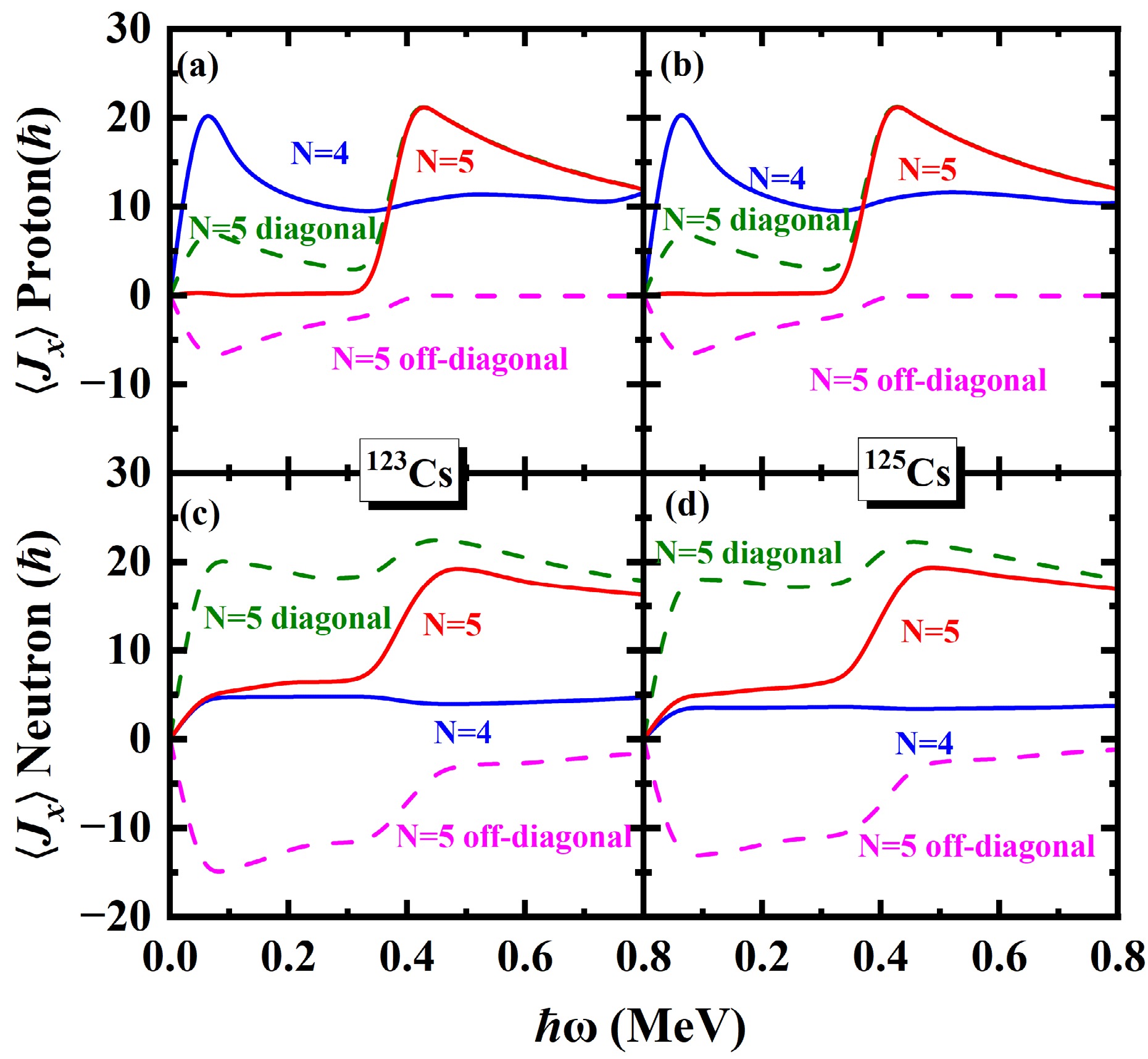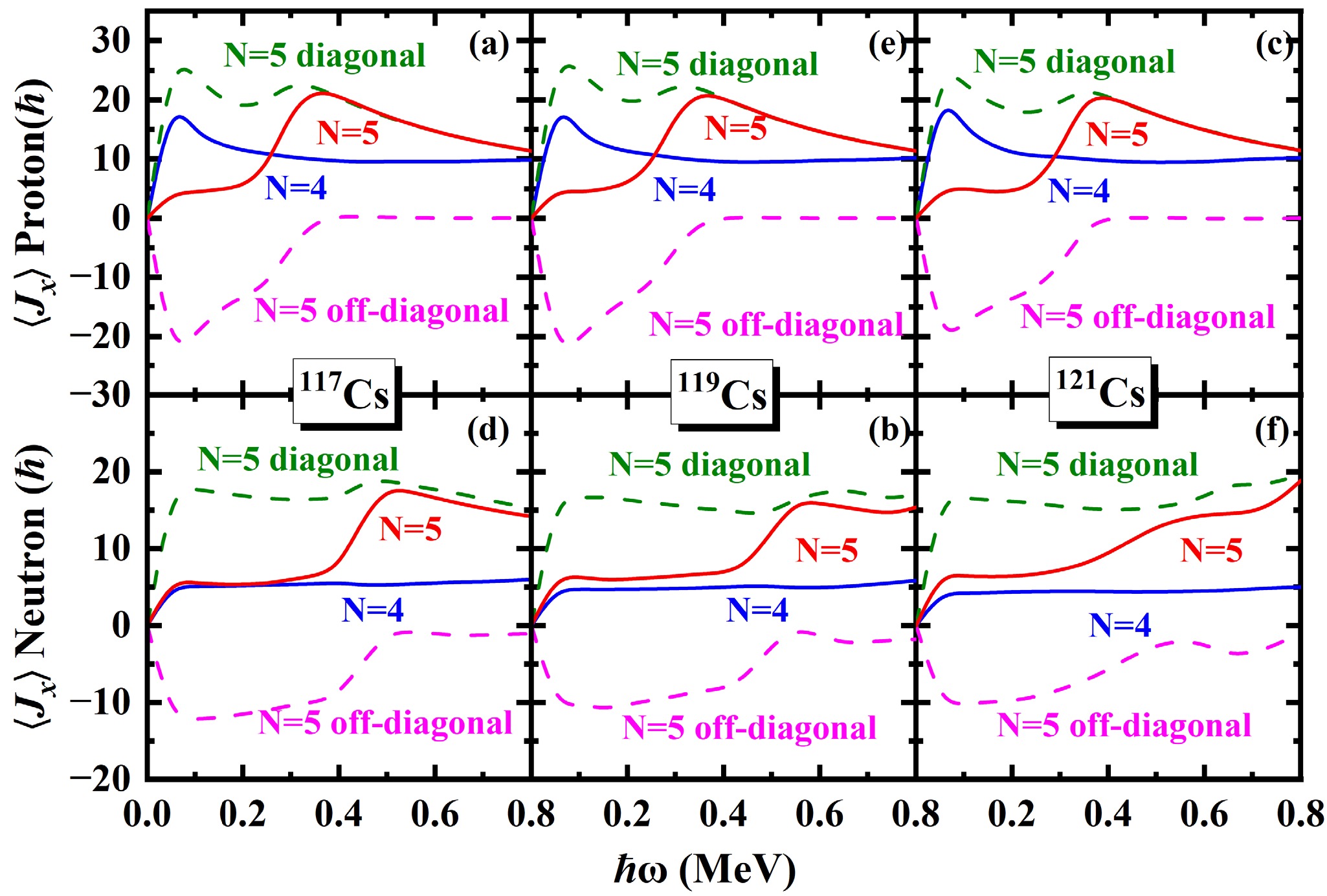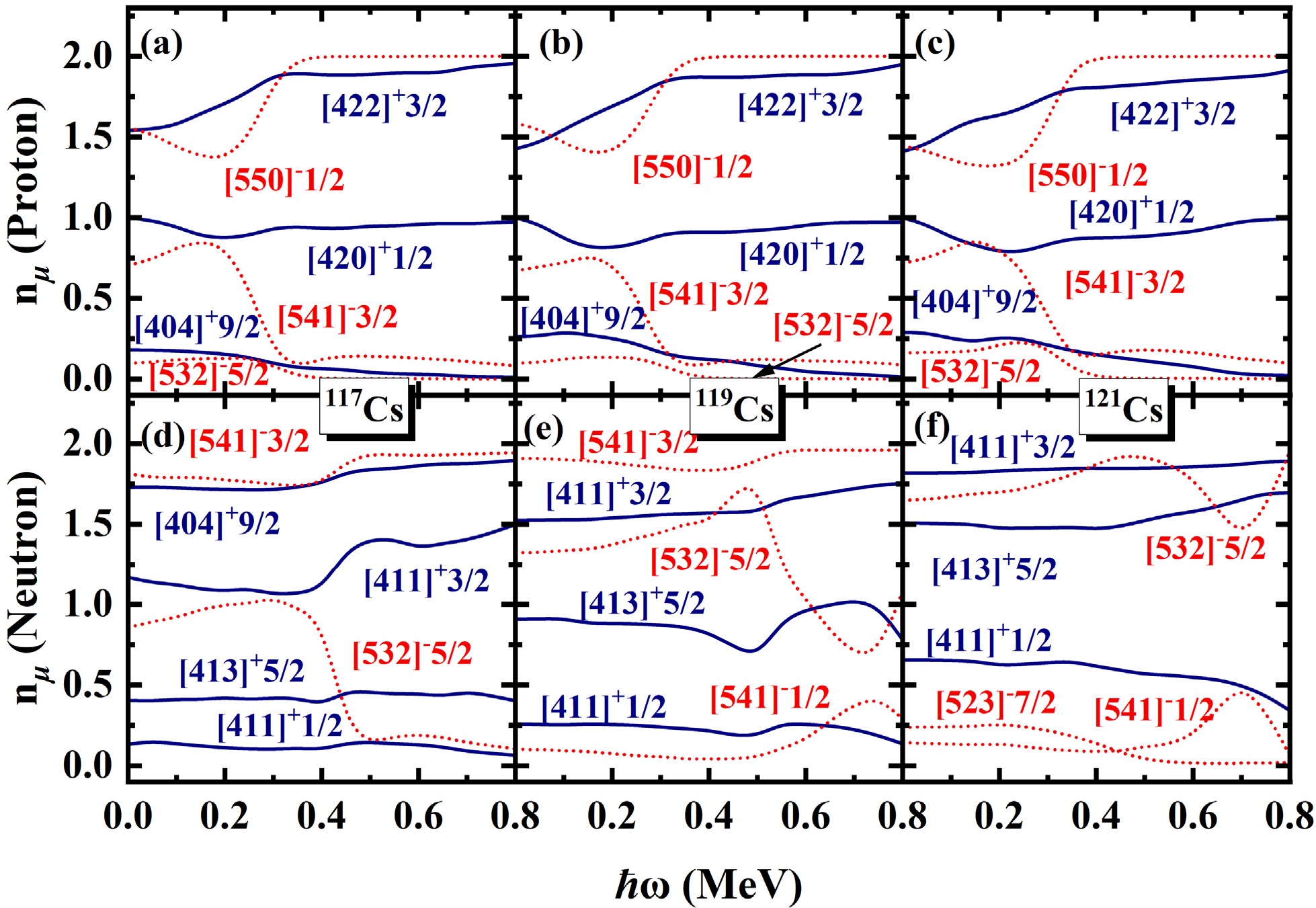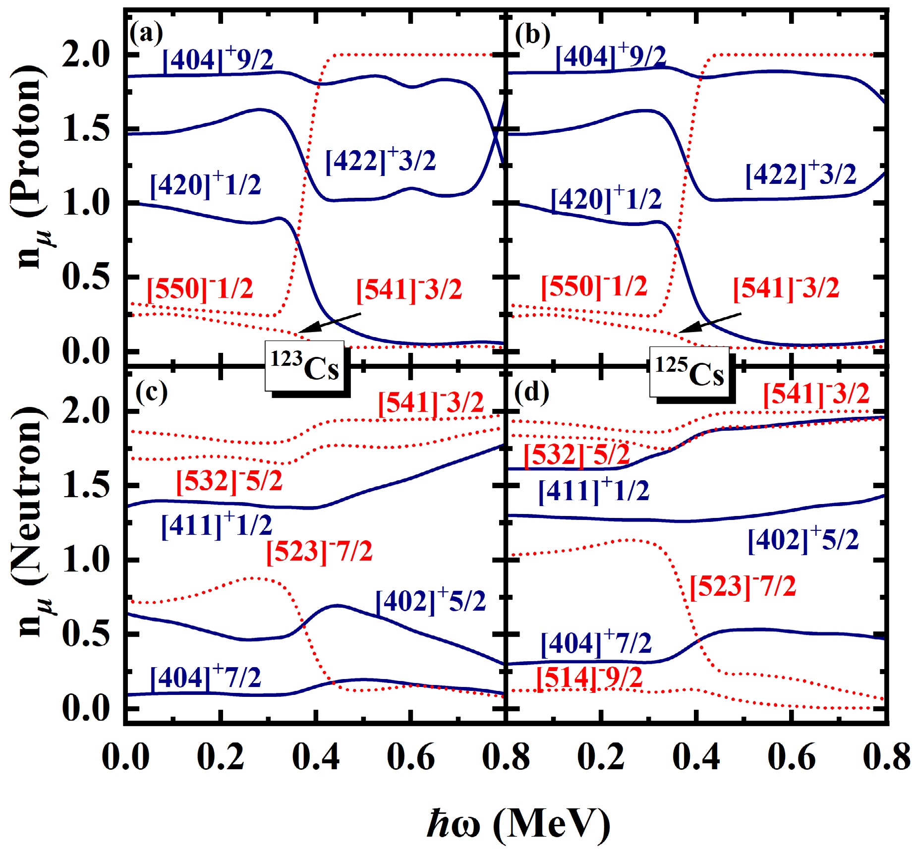 The\begin{document}$ \pi d_{5/2} $\end{document} rotational bands in odd-even nuclei 117,119,121,123,125Cs are systematically investigated using the cranked shell model (CSM) with the pairing correlations modeled with a particle number conserving (PNC) method. In this PNC method, the particle number is conserved exactly while considering the blocking effects. The experimental observations of the \begin{document}$ \pi d_{5/2} $\end{document} bands with two upbendings for 117,119Cs and one backbending for 125Cs are reproduced very well by the PNC-CSM method. Furthermore, \begin{document}$ \pi d_{5/2} $\end{document} configuration bands with two upbendings for 121Cs and one backbending for 123Cs are predicted by the PNC-CSM calculations. The difference between the lighter 117,119,121Cs and heavier 123,125Cs isotopes is caused by the evolution of single-particle orbitals near the Fermi surface, and the high-j low-Ω orbital \begin{document}$ \pi [550]1/2 $\end{document} plays an important role. The proton shell gap of lighter isotopes is at \begin{document}$ Z=50 $\end{document} , whereas it appears at \begin{document}$ Z=48 $\end{document} for heavier ones. For lighter isotopes 117,119,121Cs, the first upbending is primarily due to the off-diagonal contributions of protons \begin{document}$ j_{x}(\pi5/2^{-}[532]\pi3/2^{-}[541]) $\end{document} and \begin{document}$ j_{x}(\pi1/2^{-}[550]\pi3/2^{-}[541]) $\end{document} . The second upbending is mainly effected by the off-diagonal contributions of neutrons \begin{document}$ j_{x}(\nu7/2^{-}[523] \nu5/2^{-}[532]) $\end{document} and \begin{document}$ j_{x}(\nu3/2^{-}[541] \nu5/2^{-}[532]) $\end{document} for 117,119Cs and \begin{document}$ j_{x}(\nu1/2^{-}[541] \nu5/2^{-}[532]) $\end{document} for 121Cs, respectively. For heavier isotopes such as 123,125Cs, the backbending is attributed mainly to the diagonal parts of proton \begin{document}$ j_{x}(\pi1/2^{-}[550]) $\end{document} and neutron \begin{document}$ \nu7/2^{-}[523] $\end{document} orbital related terms of diagonal \begin{document}$ j_{x}(\nu7/2^{-}[523]) $\end{document} and off-diagonal \begin{document}$ j_{x}(\nu7/2^{-}[523] \nu5/2^{-}[532]) $\end{document} contributions.