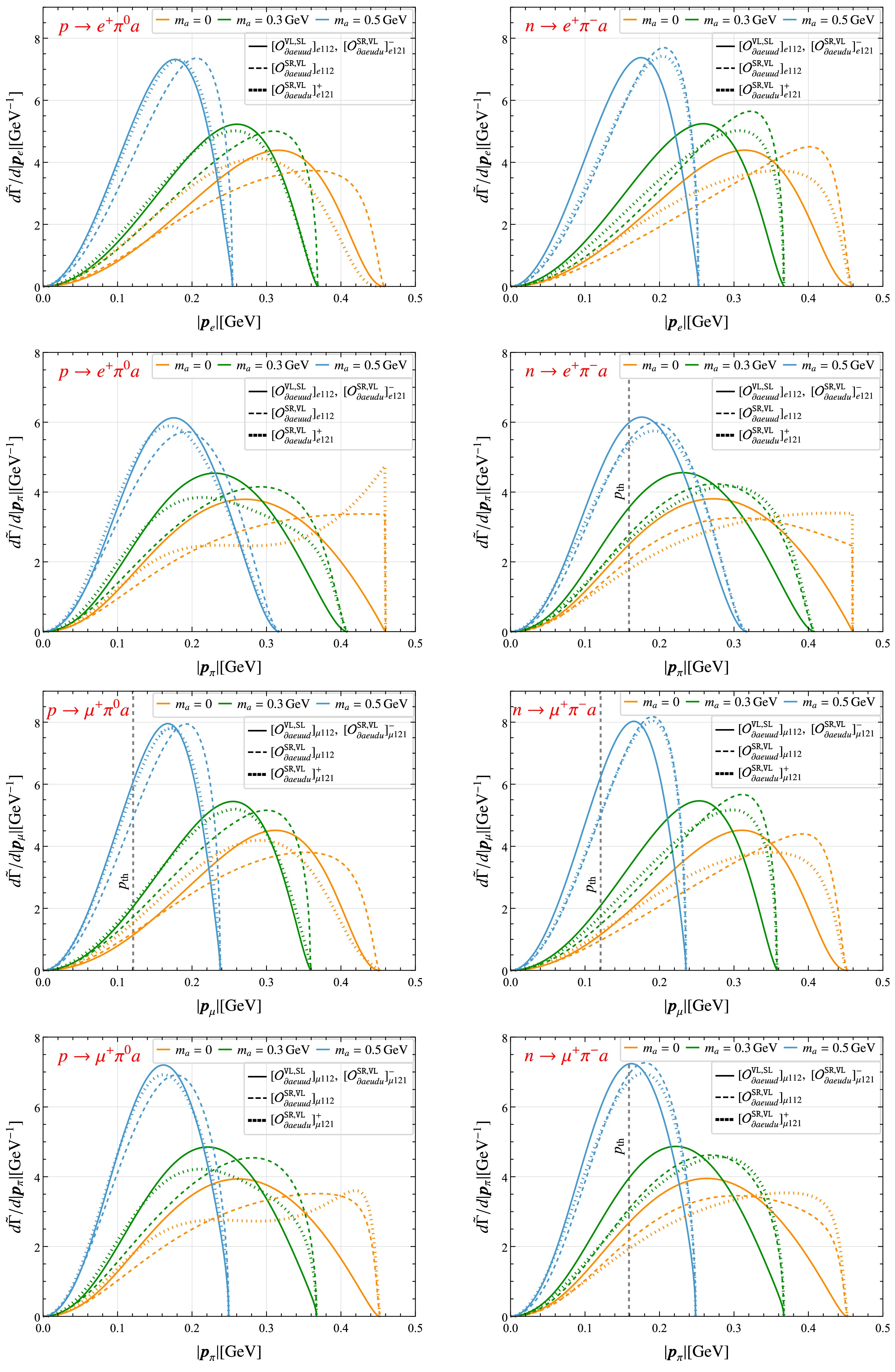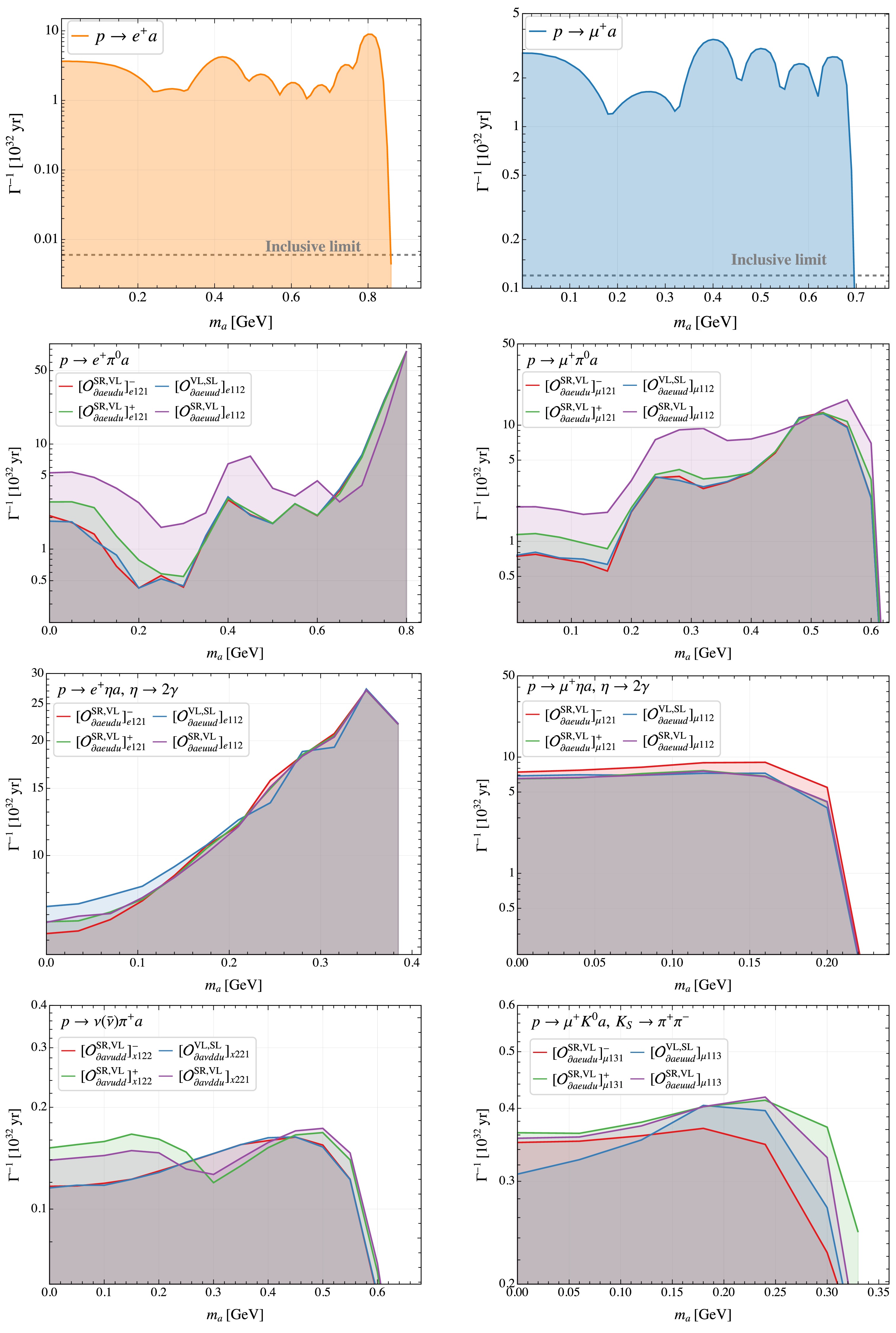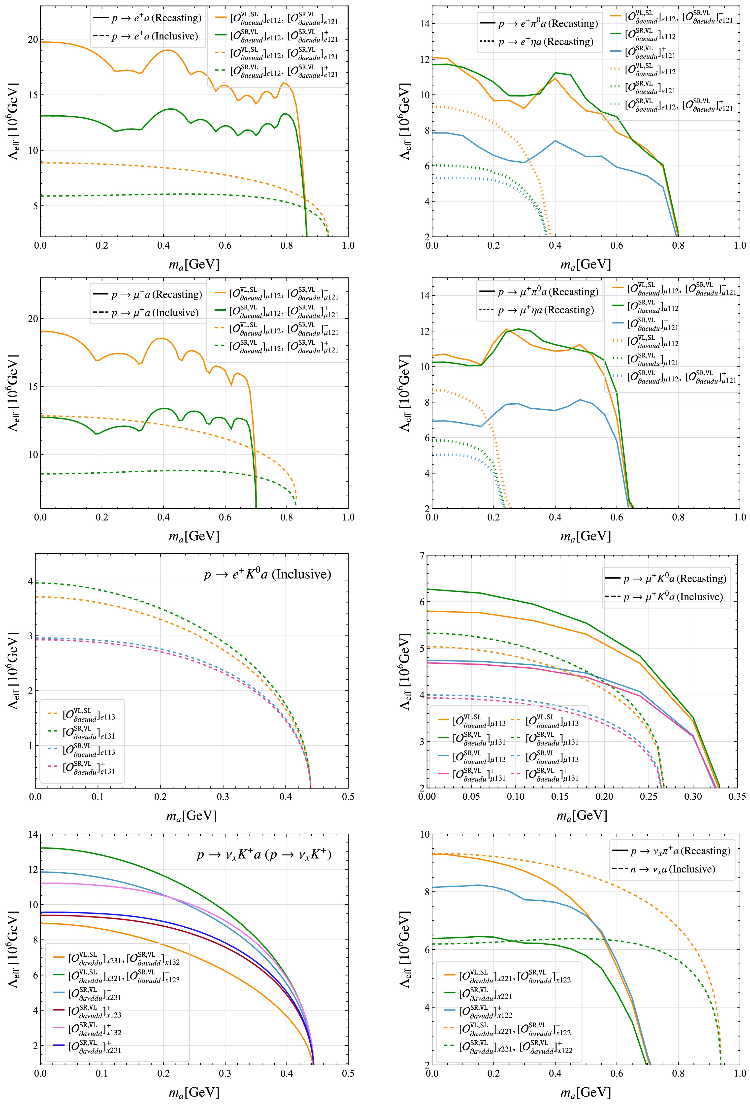 In this study, we systematically investigate baryon number violating (BNV) nucleon decays into an axion-like particle (ALP) within a low energy effective field theory extended with an ALP, which is referred to as aLEFT. Unlike previous studies in the literature, we consider contributions to nucleon decays from a complete set of dimension-eight BNV aLEFT operators involving light u, d, and s quarks. We perform the chiral irreducible representation (irrep) decomposition of these interactions under the QCD chiral group\begin{document}${S U}(3)_{\mathtt{L}}\times {S U}(3)_{\mathtt{R}}$\end{document} and match them onto the recently developed chiral framework to obtain nucleon-level effective interactions among the ALP, octet baryons, and octet pseudoscalar mesons. Within this framework, we derive general expressions for the decay widths of nucleon two- and three-body decays involving an ALP. Subsequently, we analyze momentum distributions for three-body modes and find that operators belonging to the newly identified chiral irreps \begin{document}${\bf{6}}_{{\mathtt{L}}({\mathtt{R}})}\times {\bf{3}}_{{\mathtt{R}}({\mathtt{L}})}$\end{document} exhibit markedly different behavior compared to that in the usual irreps \begin{document}${\bf{8}}_{{\mathtt{L}}({\mathtt{R}})}\times \pmb{1}_{{\mathtt{R}}({\mathtt{L}})}$\end{document} and \begin{document}${\bf{3}}_{{\mathtt{L}}({\mathtt{R}})}\times \bar{{\bf{3}}}_{{\mathtt{R}}({\mathtt{L}})}$\end{document} . In addition, we reanalyze experimental data collected by Super-Kamiokande and establish bounds on the inverse decay widths of these new modes by properly accounting for experimental efficiencies and Cherenkov threshold effects because of the lack of direct constraints on those exotic decay modes. Our recasting constraints are several orders of magnitude more stringent than inclusive bounds used in the literature. Based on these improved bounds, we set conservative limits on associated effective scales across a broad range of ALP mass and predict stringent bounds on certain neutron and hyperon decays involving an ALP.