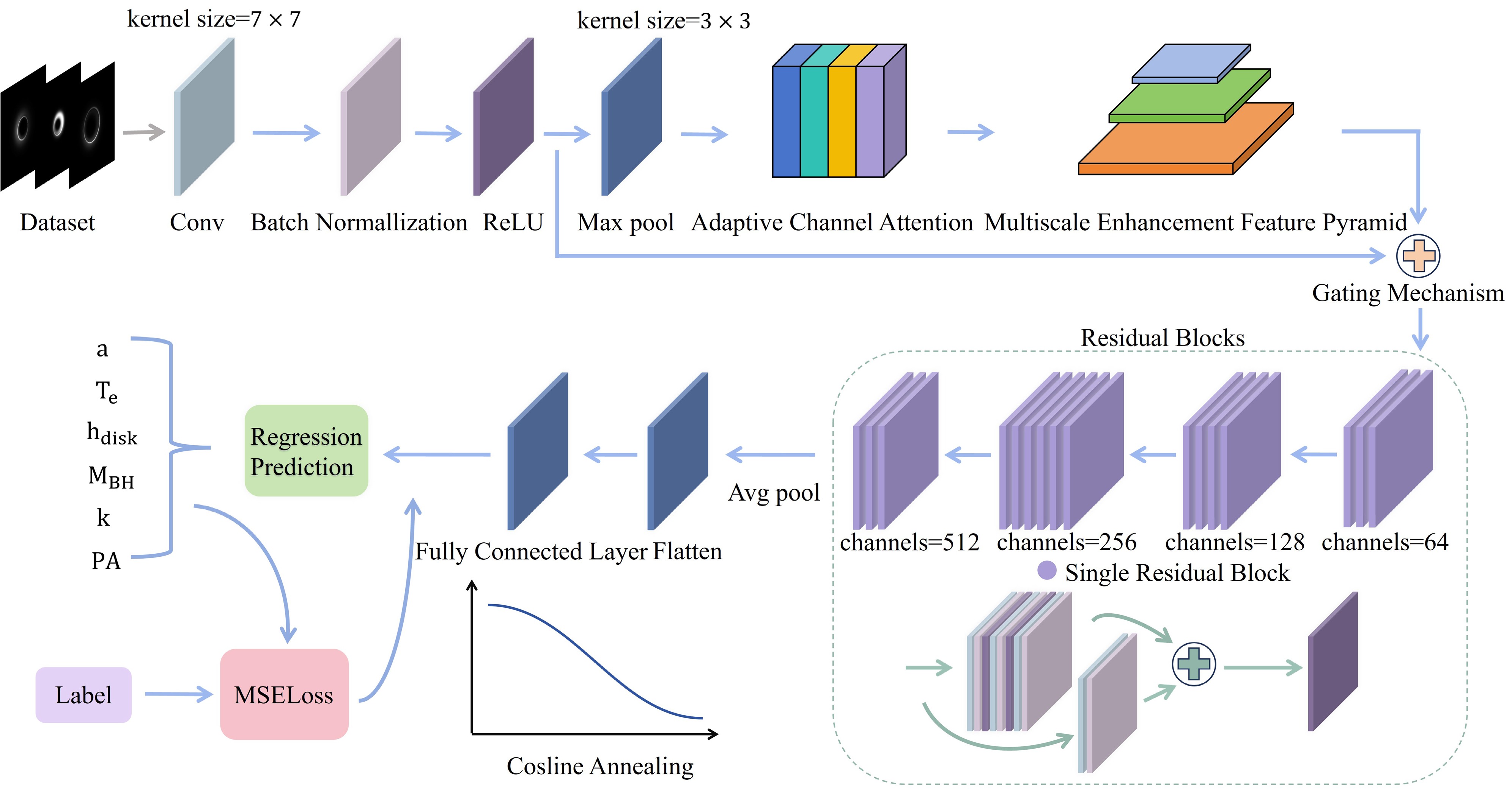 High-precision regression of physical parameters from black hole images generated by General Relativistic Ray Tracing (GRRT) is essential for investigating spacetime curvature and advancing black hole astrophysics. However, owing to limitations in observational resolution, high observational costs, and imbalanced distributions of positive and negative samples, black hole images often suffer from data scarcity, sparse parameter spaces, and complex structural characteristics. These factors pose significant challenges to conventional regression methods based on simplified physical models. To overcome these challenges, this study introduces the Multiscale Adaptive Network (MANet), a novel regression framework grounded in deep learning. MANet integrates an Adaptive Channel Attention (ACA) module to selectively enhance features in physically informative regions. Meanwhile, a Multiscale Enhancement Feature Pyramid (MEFP) is employed to capture fine-grained spatial structures, such as photon rings and accretion disks, while alleviating information loss due to downsampling. Experimental evaluations on GRRT-simulated datasets demonstrate that MANet substantially improves parameter estimation accuracy and generalization capability in high-dimensional parameter spaces, outperforming existing baseline approaches. This framework presents a promising avenue for high-precision parameter regression in Event Horizon Telescope (EHT) data analysis and broader astrophysical imaging applications characterized by sparse and noisy data.