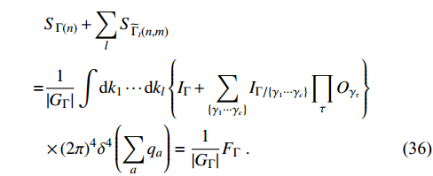 $ \begin{aligned}[b]& S_{\Gamma(n)}+\sum\limits_{l}S_{\widetilde{\Gamma}_l(n,m)}\\ =& \frac{1}{|G_{\Gamma}|}\int {\rm d}k_1\cdots {\rm d}k_l\left\{I_{\Gamma}+\sum\limits_{\{\gamma_1\cdots\gamma_c\}}I_{\Gamma/\{\gamma_1\cdots\gamma_c\}}\prod\limits_{\tau}O_{\gamma_{\tau}}\right\}\\&\times(2\pi)^4\delta^4\left(\sum\limits_a q_a\right) = \frac{1}{|G_\Gamma|}F_{\Gamma}\ . \end{aligned} $