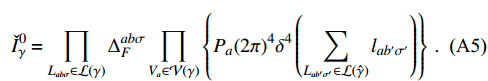 $ \tag{A5} \check{I}^0_{\gamma} = \prod\limits_{L_{ab\sigma}\in{\cal{L}}(\gamma)}\Delta^{ab\sigma}_{F}\prod\limits_{V_a\in{\cal{V}}(\gamma)}\left\{P_a(2\pi)^4\delta^4\left(\sum\limits_{L_{ab'\sigma'}\in{\cal{L}}(\hat{\gamma})}l_{ab'\sigma'}\right)\right\}\ . $