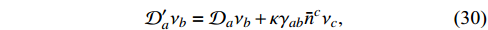 $\tag{29b} {\cal{D}}'_a\nu_b = {\cal{D}}_a\nu_b-2\varpi^{-1}\nu_{(a}{\cal{D}}_{b)}\varpi+\varpi^{-1}\gamma_{ab}\varpi^c\nu_c, $