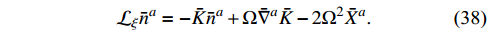 $ {\cal{L}}_\xi(\Omega^{-2}\bar L_{ab}) $ , which can be demonstrated to be$ {\cal{O}}\left({\Omega}\right) $ , Eq. (37) leads to$\tag{A8} \begin{aligned}[b] &\bar{n}_{(a}\left[3X_{b)}+ \bar{\nabla}_{b)}- \bar{\nabla}^cX_{b)c}+\frac{2\omega+3}{2} \bar{\varphi}( {\cal{L}}_\xi \bar{\varphi}+ \bar{K} \bar{\varphi}) \bar{n}_{b)}\right]\\&\quad -\frac{1}{6} \bar{g}_{ab}( \bar{\nabla}_c \bar{\nabla}^c \bar{K}+4 \bar{n}^cX_c+2 {\cal{L}}_{ \bar{n}}X)\ddot = 0. \end{aligned} $
