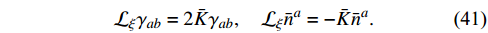 $ {\cal{L}}_{ \bar{n}}\vartheta $ and$ {\cal{L}}_{ \bar{n}}\bar R $ . Then, Eq. (A7b) becomes useful, setting$ \xi^a = \bar{n}^a $ . Thus, we obtain$\tag{B13} X^{ \bar{n}}_{ab} = -\frac{\vartheta}{2} \bar{g}_{ab}-\frac{1}{2}(\bar S_{ab}-\Omega^{-2}\bar L_{ab}),\quad X^{ \bar{n}}_a = \frac{ \bar{\nabla}_a\vartheta}{2}, $
