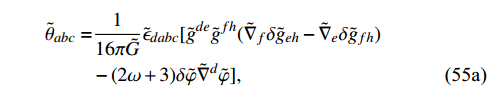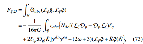 $ \lambda_{ab} = \Omega {\cal{L}}_\xi \tilde{g}_{ab} = \Omega^{-1}( {\cal{L}}_\xi \bar{g}_{ab}-2 \bar{K} \bar{g}_{ab}) $ ,$ \lambda = \bar{g}^{ab}\lambda_{ab} $ , and$ \lambda_a = \lambda_{ab} \bar{n}^b/\Omega $ . The first three terms add up to a quantity proportional to the so-called “flux” defined by Eq. (19) in Ref. [56], in which the gauge condition$ \tilde{\nabla}_a\xi^a = 0 $ was imposed. As discussed in that study, their flux can also be calculated using Eq. (20), which is gauge invariant. In the current case, we can also rewrite the above expression as follows:$\tag{B4} F(\alpha)\ddot = - \bar{\nabla}_a \bar{\nabla}_b\lambda^{ab}+3 \bar{\nabla}_a\lambda^a+\frac{3}{4} \bar{\nabla}^2\lambda+\frac{1}{24}\bar R\lambda+(2\omega+3)\chi\bar N. $