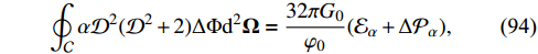 $\tag{103b} \oint_{{\cal{C}}}\alpha{\cal{D}}^2({\cal{D}}^2+2)\Delta\Phi_o {\rm{d}}^2{\bf{\Omega}} = \frac{32\pi G_0}{\varphi_0}\Delta{\cal{P}}_\alpha. $