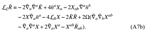 $\tag{A7b} \begin{aligned}[b] {\cal{L}}_\xi\bar R =& -2 \bar{\nabla}_a \bar{\nabla}^a \bar{K}+4 \bar{n}^aX_a-2X_{ab} \bar{\nabla}^a \bar{n}^b\\&-2X \bar{\nabla}_a \bar{n}^a-4 {\cal{L}}_{ \bar{n}}X-2 \bar{K}\bar R+2\Omega( \bar{\nabla}_a \bar{\nabla}_bX^{ab}\\&- \bar{\nabla}_a \bar{\nabla}^aX+2 \bar{\nabla}_aX^a-X^{ab}\bar R_{ab}). \end{aligned} $