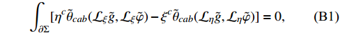 $ \eta^a $ or$ \xi^a $ are a Killing vector field, Eq. (86) is satisfied [39]. As in GR, we only have to check if$\tag{B1} \int_{ \partial\Sigma}[\eta^c\tilde\theta_{cab}( {\cal{L}}_\xi \tilde{g}, {\cal{L}}_\xi \tilde{\varphi})-\xi^c\tilde\theta_{cab}( {\cal{L}}_\eta \tilde{g}, {\cal{L}}_\eta \tilde{\varphi})] = 0, $
