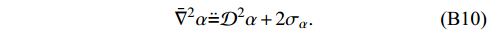 $ \bar{\nabla}^2 \bar{\nabla}^2\alpha $ , one needs$\tag{B11}\begin{aligned}[b] {\cal{L}}_{ \bar{n}} \bar{\nabla}^2\alpha =& 2 {\cal{L}}_{ \bar{n}}\sigma_\alpha+\Omega\bigg( \bar\nabla^2\sigma_\alpha+2\vartheta\sigma_\alpha-\frac{\bar R\sigma_\alpha}{3}\\&+\frac{1}{6}\bar\nabla_a\alpha\bar\nabla^a\bar R-\vartheta\bar{\nabla}^2\alpha+\bar S^{ab}\bar\nabla_a \bar\nabla_b\alpha\bigg)+{\cal{O}}\bigg({\Omega^2}\bigg),\end{aligned} $