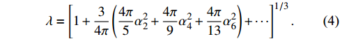 $ \lambda = \left[1+\frac{3}{4\pi} \left(\frac{4\pi}{5} \alpha_2 ^2+\frac{4\pi}{9} \alpha_4 ^2+\frac{4\pi}{13} \alpha_6 ^2\right)+\cdot\cdot\cdot\right]^{1/3}.$