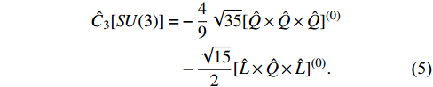 (4) $\begin{aligned}[b] \hat{C}_{3}[S U(3)]=&-\frac{4}{9}\sqrt{35}[\hat{Q}\times \hat{Q} \times \hat{Q}]^{(0)}\\&-\frac{\sqrt{15}}{2}[\hat{L}\times \hat{Q} \times \hat{L}]^{(0)}.\end{aligned} $