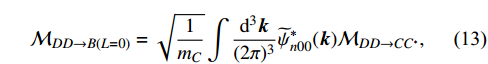 $ \mathcal{M} _{DD \rightarrow B(L=0)} = \sqrt{\frac{1}{m_C}}\int \frac{{\rm d}^3{\boldsymbol{k}}}{(2\pi)^3} \widetilde{\psi}_{n00} ^*({\boldsymbol{k}})\mathcal{M}_{DD\rightarrow CC^*}, $