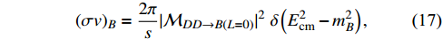 $ (\sigma v)_B = \frac{2\pi}{s}|\mathcal{M} _{DD\rightarrow B(L=0)}|^2 \ \delta \left(E_{\rm cm}^2-m_B^2\right), $