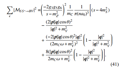 $ \begin{aligned}[b] \sum_{\epsilon}|\mathcal{M}_{SS^*\rightarrow BV}|^2 =&\Bigg(\frac{-2g_3g_5g_6}{s-m_{Z^\prime}^2}\Bigg)^2\frac{1}{m_C}\frac{1}{\pi(na_0)^3}\Bigg[(s-4m_S ^2)\\&-\frac{(2|{\boldsymbol{p}}||{\boldsymbol{q}}|\cos\theta)^2}{|{\boldsymbol{q}}|^2+m_V^2}\\ &+\frac{(-2|{\boldsymbol{p}}||{\boldsymbol{q}}|\cos\theta)^2|{\boldsymbol{q}}|^2}{(2m_C\omega+m_V^2)^2}\left(1-\frac{|{\boldsymbol{q}}|^2}{|{\boldsymbol{q}}|^2+m_V^2}\right)\\ &+\frac{8(|{\boldsymbol{p}}||{\boldsymbol{q}}|\cos\theta)^2}{2m_C\omega+m_V^2}\left(1-\frac{|{\boldsymbol{q}}|^2}{|{\boldsymbol{q}}|^2+m_V^2}\right)\Bigg]. \end{aligned} $