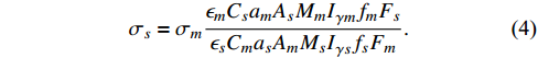 $ {\sigma }_{s}={\sigma }_{m}\frac{{\epsilon }_{m}{C}_{s}{a}_{m}{A}_{s}{{M}_{m}I}_{\gamma m}{f}_{m}{F}_{s}}{{\epsilon }_{s}{C}_{m}{a}_{s}{A}_{m}{{M}_{s}I}_{\gamma s}{f}_{s}{F}_{m}}. $