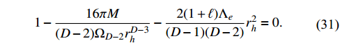 $ \begin{array}{*{20}{l}} 1-\dfrac{16\pi M}{(D-2)\Omega_{D-2}r_h^{D-3}}-\dfrac{2(1+\ell)\Lambda_e}{(D-1)(D-2)}r_h^2=0. \end{array} $