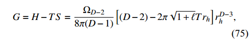 $ \begin{array}{*{20}{l}} G=H-TS=\dfrac{\Omega_{D-2}}{8\pi (D-1)}\left[(D-2)-2\pi\sqrt{1+\ell}Tr_h\right]r_h^{D-3}, \end{array} $