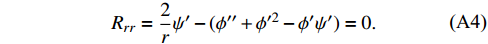 $ R_{rr}=0 $ becomes$ \begin{array}{*{20}{l}} R_{rr}=\dfrac{2}{r}\psi'-(\phi''+\phi'^2-\phi'\psi')=0. \end{array}\tag{A4} $