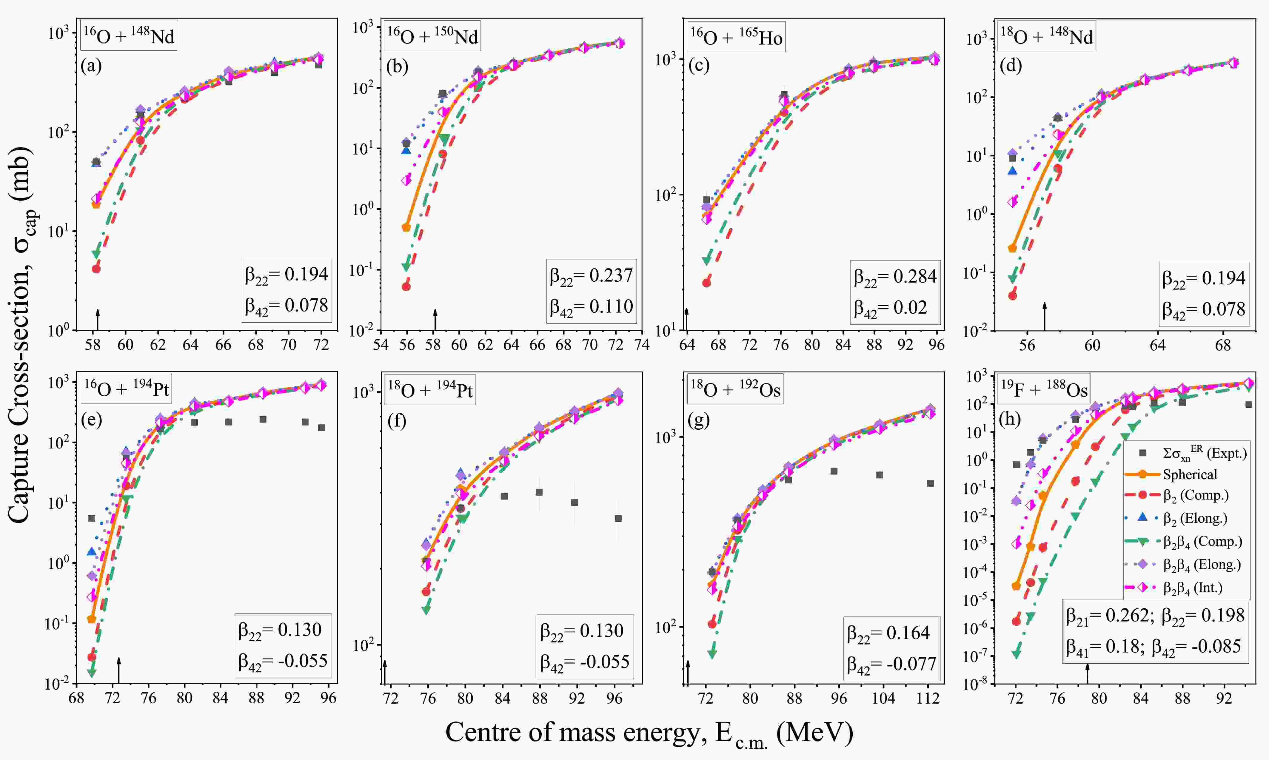 • Past research shown that the deformations and orientations (compact and elongated) associated with the interacting nuclei alter the barrier characteristics $ V_B $, $ R_B $, $ \hbar\omega $, etc., which further influence the capture cross-sections ($ \sigma_{\rm cap} $). We have evaluated $ \sigma_{\rm cap} $ by incorporating the deformations (up to $ \beta_4 $) of the interacting nuclei chronologically (i.e. $ \beta_2 $ and $ \beta_2\beta_4 $) at respective compact, elongated orientations ($ \theta_i $) and integrating over all the orientations of the considered P-T combinations. The $ \sigma_{\rm cap} $ are calculated within the same plane ($ \phi $=0) for the center of mass energies ($E_{\rm c.m.}$) lying across the Coulomb barrier, as depicted in Fig. 1. The $ \ell $-values used to incorporate angular momentum effects are calculated using the sharp cut-off approximation. Fig. 1 shows different cross-section trends for different combinations of deformations at their respective compact/elongated configurations along with the cross-sections integrated over all the orientations in comparison to the spherical system. For example, the presence of $ \beta_{2}^+ $ deformation reduces cross-sections in the compact configuration due to a small interaction radius at the highest barrier height. However, in the elongated configurations of $ \beta_{2}^+ $, the cross-sections are enhanced relative to the spherical case due to the larger interaction radius at the smallest barrier height, as illustrated in Fig. 1(a-h). Further incorporating $ \beta_4^+ $ deformation in $ \beta_2^+ $ elongates the nuclear shape, which increases the interaction radius. Therefore, the cross-sections are further enhanced for both configurations (i.e. compact and elongated) of $ \beta_2^+ $$ \beta_4^+ $ compared to $ \beta_2^+ $ only, which is illustrated in Fig. 1(a-d). For the reactions shown in Fig 1(e-h), the inclusion of $ \beta_4^- $ deformations to the $ \beta_2^+ $ of the target nuclei produces reduced cross-sections in both compact and elongated configurations compared to cross-sections obtained by $ \beta_2^+ $ deformation alone. This suppression is attributed to the compressive effects of $ \beta_4^- $, reducing the interaction radius relative to $ \beta_2^+ $. The integrated cross-sections ($\sigma_{\rm int}$) obtained for the considered $ \beta_2\beta_4 $ deformed nuclei represent the average effect of all orientations. These integrated capture cross-sections ($\sigma_{\rm int}$) are between the cross-sections obtained by compact and elongated configurations, reflecting the combined effects of nuclear shapes and interaction dynamics across all orientations.