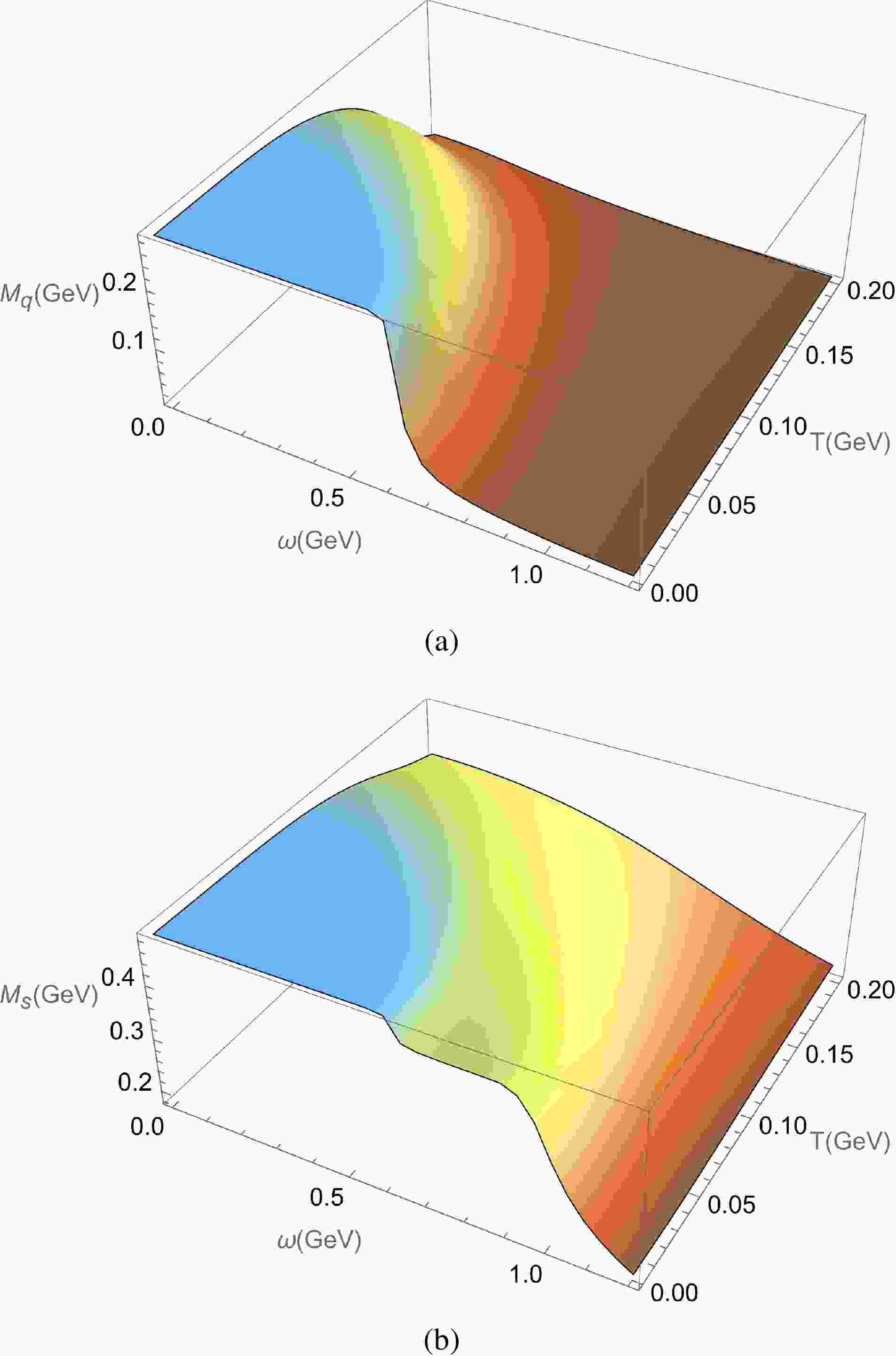Figure 3.  (color online) Effective masses of light and strange quarks as functions of temperature T and quark chemical potential $ \mu $ for $ \omega=0.1 $ GeV.