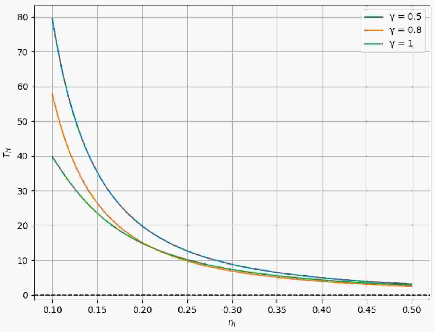 $ r_h $ and decreases rapidly as$ r_h $ increases. The nonlinearity parameter γ significantly affects the temperature profile, with smaller values of γ leading to more pronounced temperature increases at small radii. This behavior has important implications for the final stages of black hole evaporation, suggesting that nonlinear electromagnetic effects could substantially modify the standard picture of black hole thermodynamics.Figure 1. (color online) Plot of Hawking temperature
