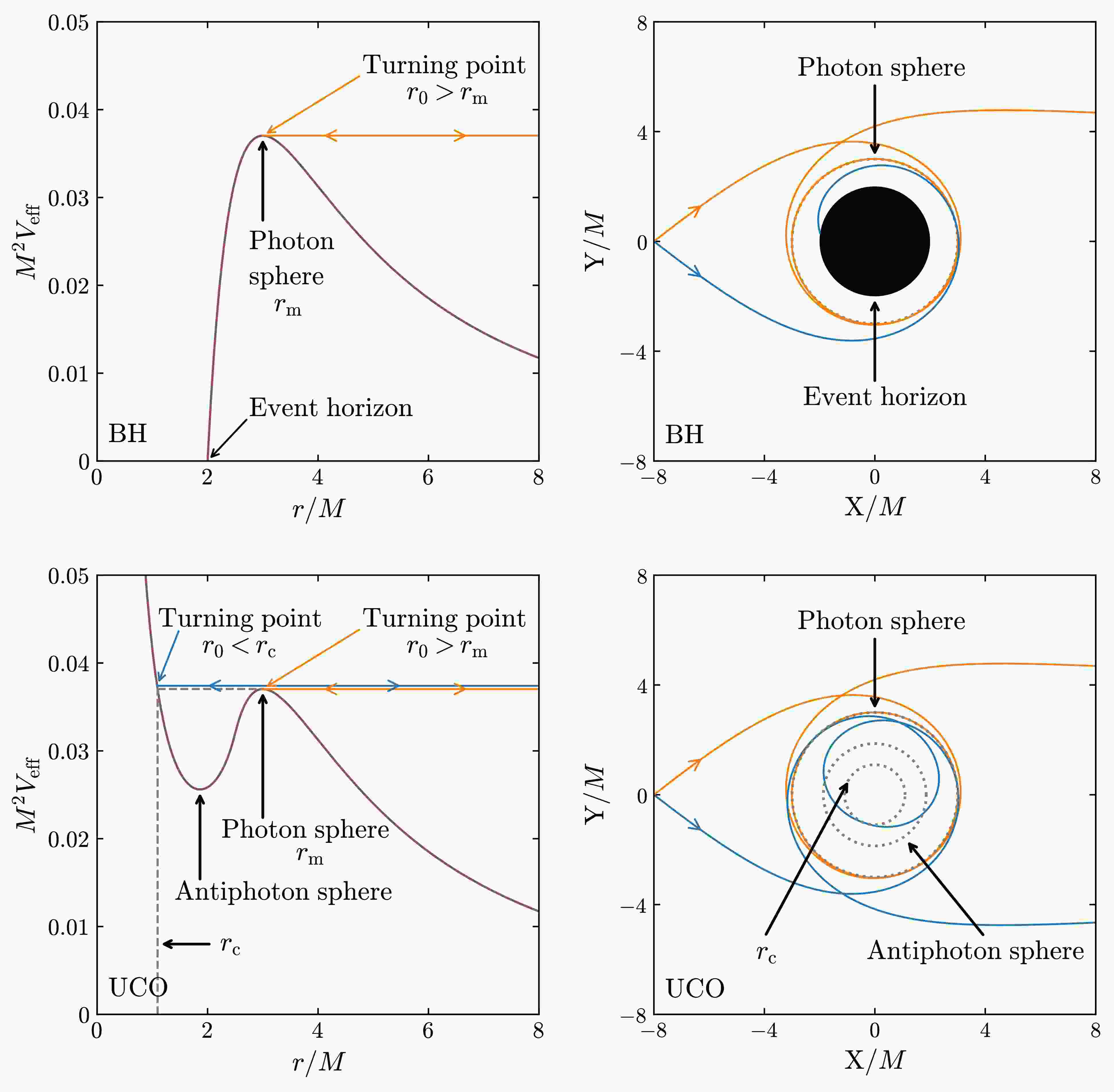 Figure 1.  (color online) Effective potential $ V_{\rm{eff}} $ and photon trajectories in the black hole spacetime (first row) and ultracompact object spacetime (second row). Both the black hole and ultracompact object have a photon sphere located at $ r = r_{\rm{m}} $; therefore, the deflection of photons outside their photon sphere is similar (orange line). Unlike the black hole, the ultracompact object does not have an event horizon but has a unique antiphoton sphere and spherical surface $ r = r_{\rm{c}} $ with $ V_{\rm{eff}} ( r_{\rm{c}} ) = V_{\rm{eff}} ( r_{\rm{m}} ) $, which causes photons entering the photon sphere of the ultracompact object to escape (blue line). Here, we use the Schwarzschild black hole (BH) and Schwarzschild star (UCO) to illustrate and set $ G=c=1 $.