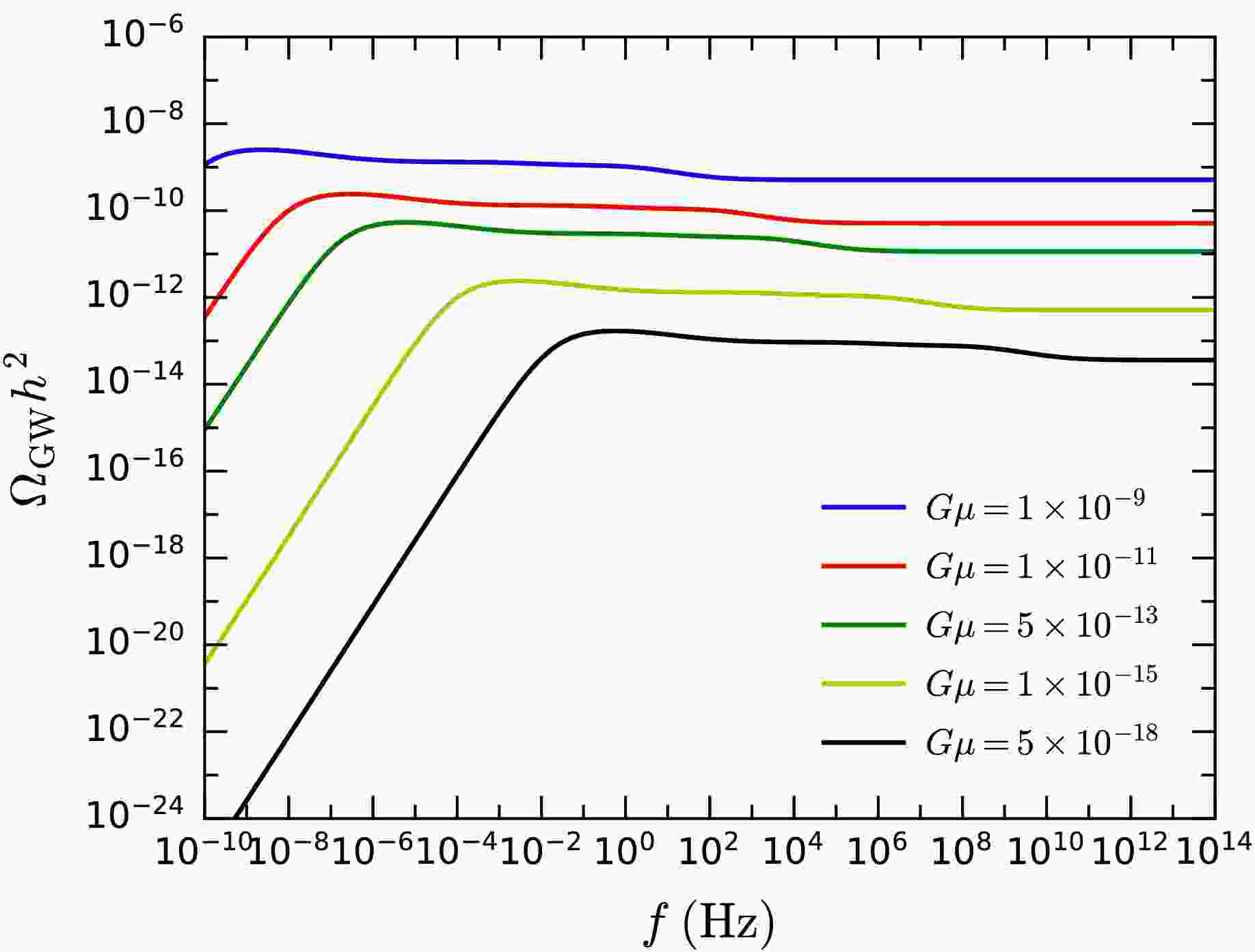 • In a scalar field theory with a global or gauge $ {U}(1) $ symmetry, CSs could be formed after the spontaneous breaking of the $ {U}(1) $ symmetry in the early universe. They are one-dimensional topological defects concentrating energy of the scalar field (and the gauge field for the gauged case) [69]. In the Nambu-Goto approximation, CSs are described as infinitely thin objects with tension μ, which is the energy per unit length. The dimensionless quantity $ G\mu $ is commonly used to represent the CS tension. Considering the dynamics of CSs, these combined factors establish CSs as promising sources of GWs [35, 70].