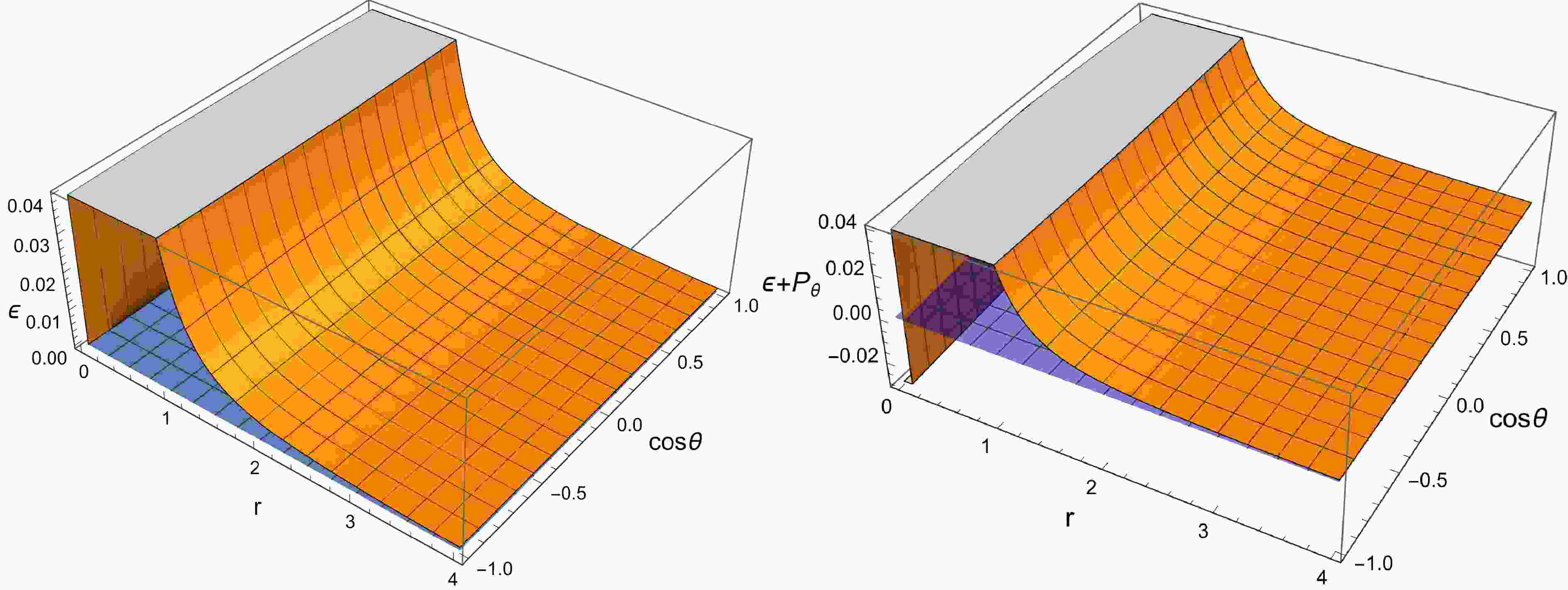 Figure 2.  (color online) Dependence of matter density $ \epsilon $ and $ \epsilon+p_{\theta} $ on radius and angle for a rotating and nonlinear magnetic-charged black hole with an anisotropic matter field for $ M=1 $, $ Q=0.5 $, $ a=0.9 $, $ K=1 $, and $ \omega =0.2 $.