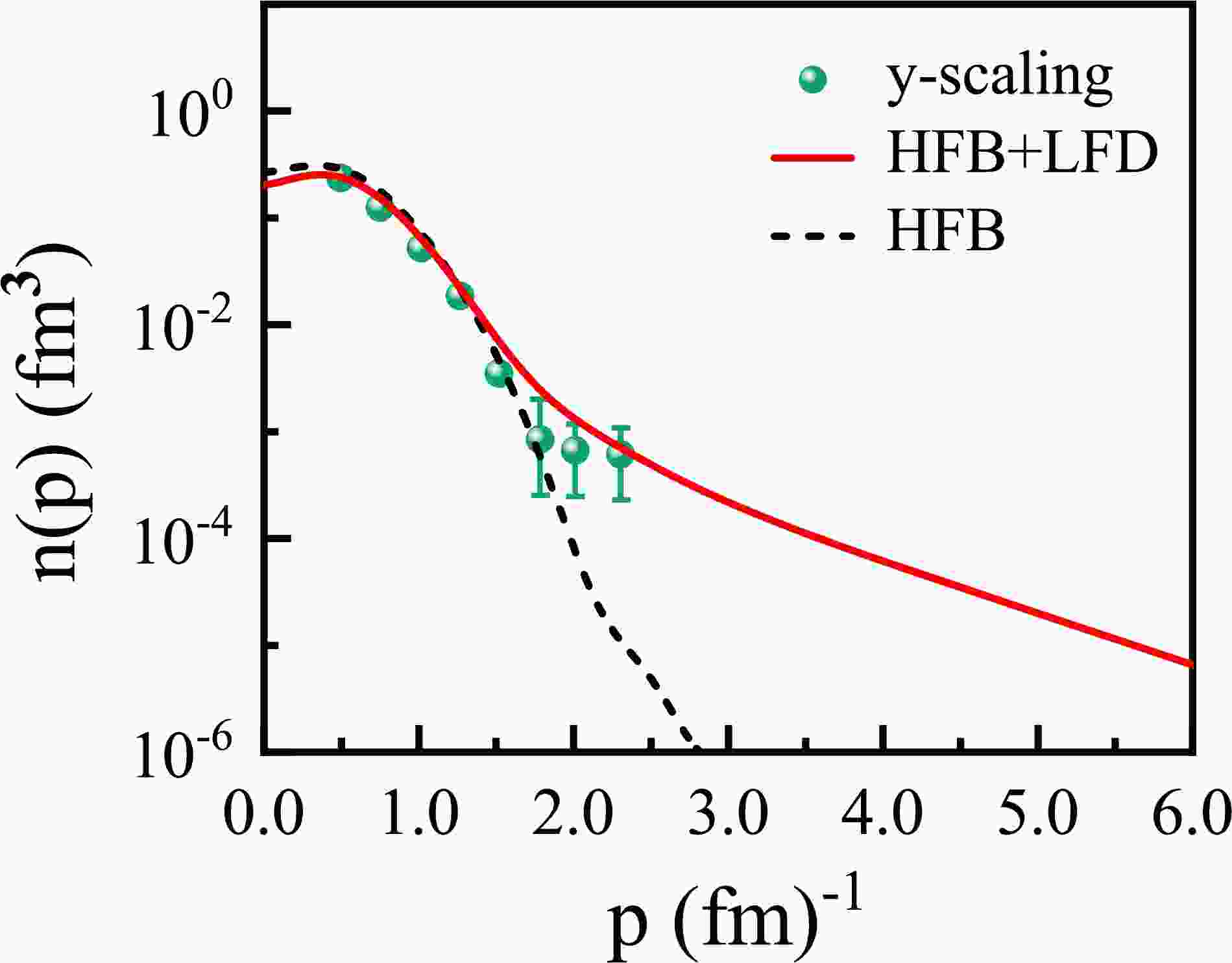 $ \beta = -0.1 $ ).$ \beta $ represents the quadrupole deformation of the nucleus [37]. The black dashed line depicts the n(p) calculated using the HFB model, whereas the red solid line represents the n(p) obtained using the HFB+LFD method. The NMDs extracted from the y scaling analyses on$ \left(e, e^{\prime}\right) $ experiments are also provided in this figure for comparison [33]. From Fig. 1, we can see that the HFB calculations provide accurate descriptions of the NMD under the Fermi momentum$ p_F $ . For$ p>p_F $ , n(p) from the MF model decreases rapidly and diverges from the experimental data. By introducing the NN-SRC contributions with the LFD method, the tail values of n(p) are enhanced, yielding a 24% proportion of high-momentum neutrons above the Fermi surface. This result shows excellent agreement with the y-scaling analysis measurements. Through contrastive analysis, the LFD results in Fig. 1 are found to be in agreement with the calculations from the realistic nucleon-nucleon interactions, such as Nijmegen-I, -II, -Reid, Argonne$ v_{18} $ , and Paris NN potentials [40].Figure 1. (color online) Total momentum distribution n(p) of 12C for the configuration