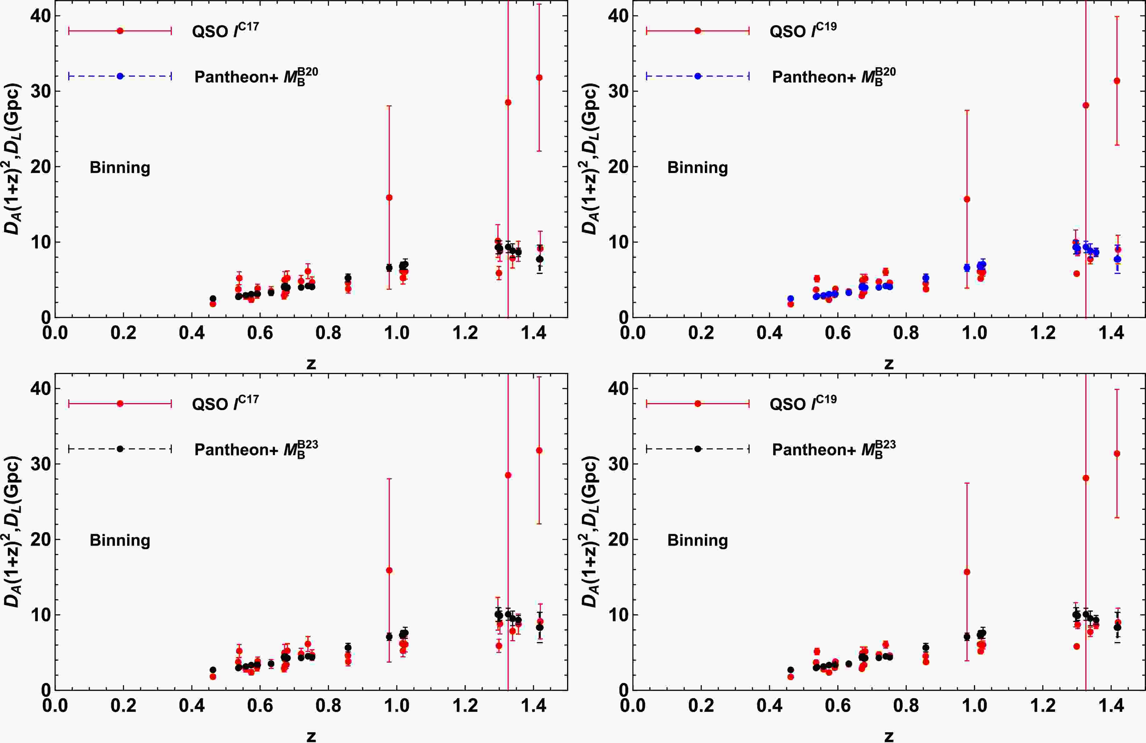 Figure 1.  (color online) Sample catalogs of the observed $ D_{\rm{A}}(1+z)^2 $ distribution from the QSO data points and corresponding LD $ D_{\rm{L}} $ from Pantheon+ data obtained with the priors of $ M_{\rm{B}}^{\rm{D20}} $ (upper panel), $ M_{\rm{B}}^{\rm{B23}} $ (bottom panel), $ l^{\rm{C17}} $ (left panel), and $ l^{\rm{C19}} $ (right panel), respectively, in the binning method.