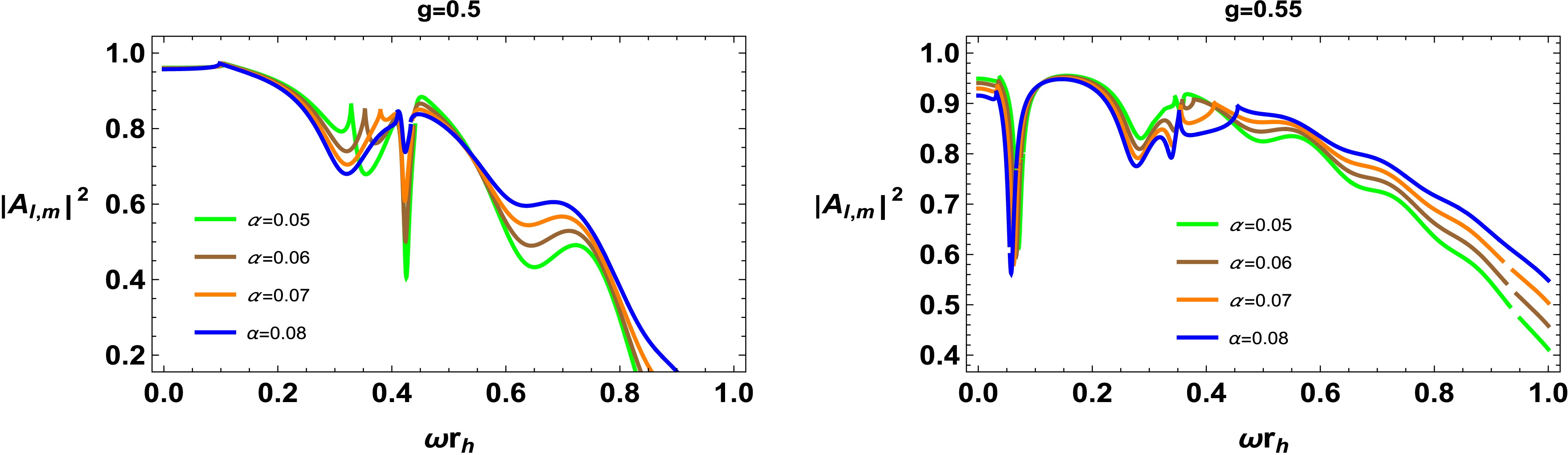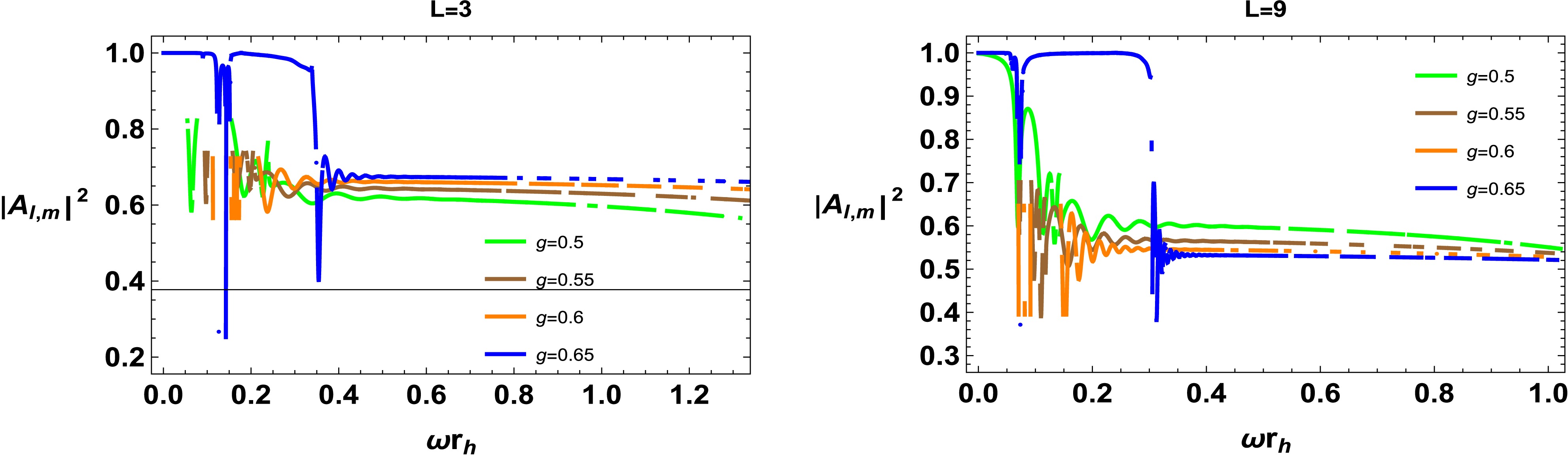 (72) The absorption rate of the scalar field varies along the radial direction, as shown in Figs. 9−11. After the fluctuations, the absorption rate decreases with an increase in the cloud of strings parameter. In addition, the charge of the geometry affects the absorption rate with a decrease observed with an increase in the BH charge , as shown in Fig. 10. For larger values of L, the absorption rate fluctuates initially and then exhibits smooth behavior as the frequency rises. It is important to note that the absorption rate is affected by the parameters a and g (Fig. 11). For smaller values of g, the fluctuation is less pronounced at lower frequencies. The absorption rate decreases with increasing frequency and is further affected by the parameters of the BH.