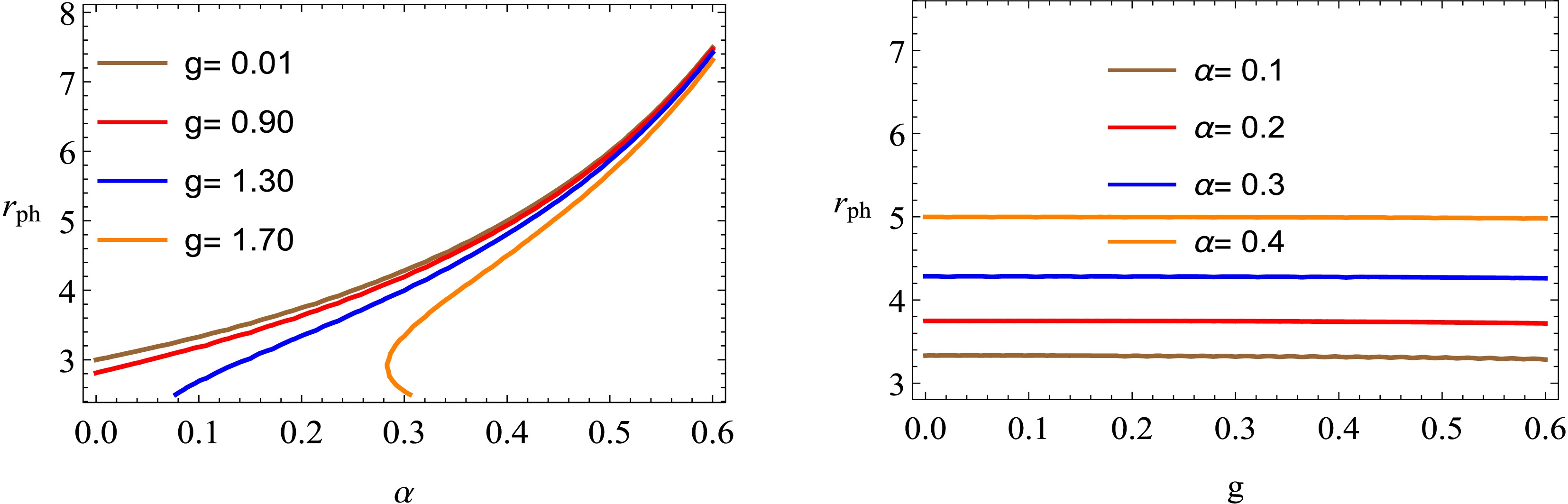 $ r_{ph} $ in Hayward-Letelier BHs in AdS spacetime could be evaluated by solving Eq. (7) along with Eq. (2). The solution is complex, and therefore a numerical method is used to plot$ r_{ph} $ directly without deriving its explicit expression. The shift in the photon orbit radius is illustrated in Fig. (3). The photon radius$ r_{ph} $ along α decreases with an increase in g, and$ r_{ph} $ along g increases with an increase in α. It is important to note that the expression calculating the photon radius$ r_{ph} $ is independent of L, and therefore there is no relative change in$ r_{ph} $ with L.Analysis of BH shadows provides valuable information related to the apparent diameter of the event horizon and can reveal insights into the spin of the BH and accretion disk orientation. In studying these shadows, GR is tested in extreme gravity environments, offering insights into the astrophysical properties and evolution of BHs. Advances in observational methods such as very long baseline interferometry (VLBI) have enhanced our ability to resolve and study these shadows with greater precision, opening new opportunities for investigating BHs and their surrounding environments. We study the shadows of the BH in Hayward-Letelier gravity, which is determined by [160]: