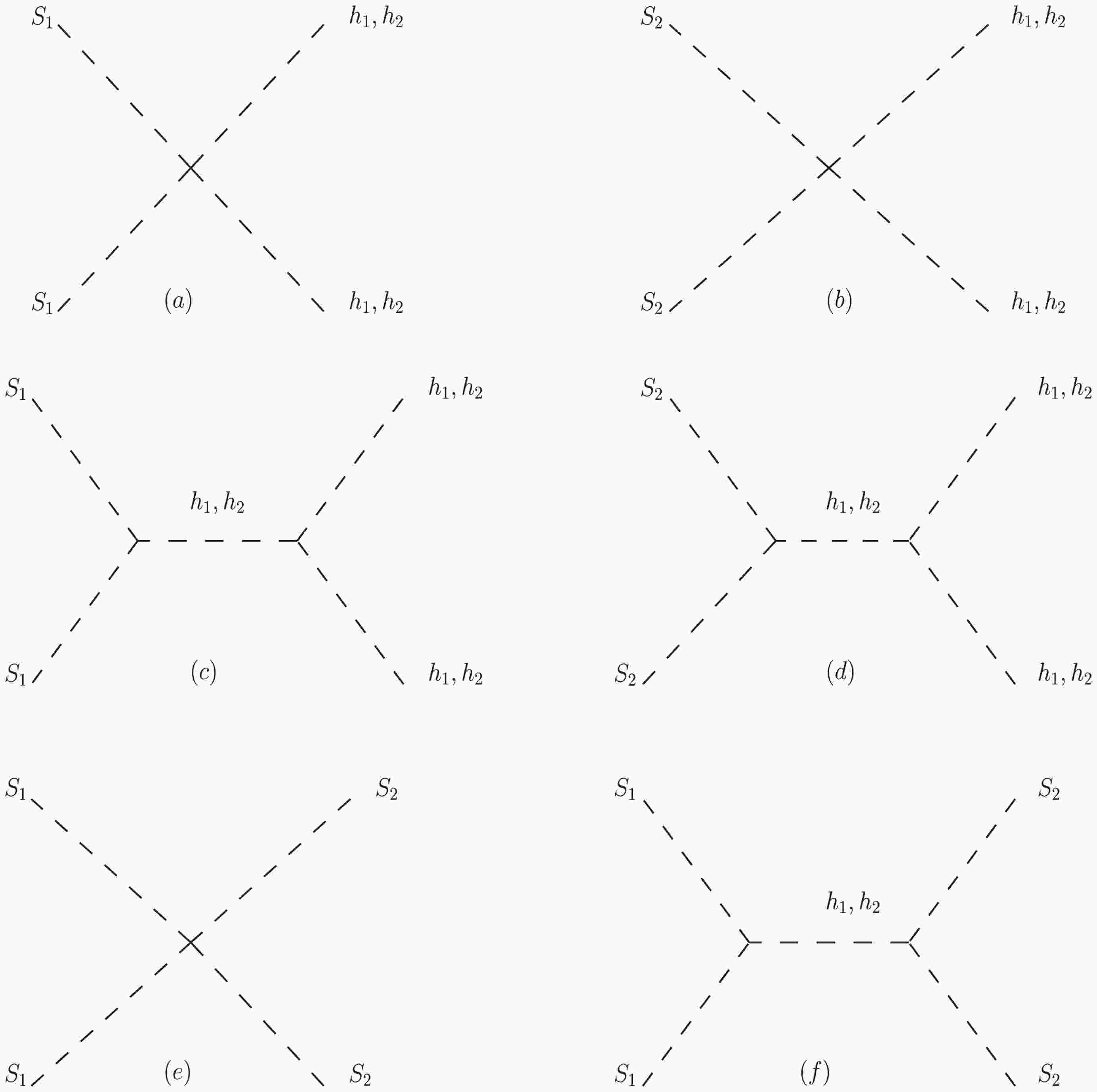 $ S_iS_i \to h_ih_i $ and$ S_iS_i \to h_1h_2 $ $ (i = 1,2) $ in this section. We calculate the cross section using Calchep [40]. The expressions in the limit of$ \sin\theta\to 0 $ are given as$ \begin{aligned}[b] \sigma_{S_1S_1 \to h_1h_1} =\;& \dfrac{\lambda_{14}^2}{8 \pi s (s-4 m_1^2)} \left(\sqrt{(s-4 m_{h_1}^2) (s-4 m_1^2)} \Bigg( \dfrac{8 \lambda_{14}^2 v_0^4}{m_{h_1}^4-4 m_{h_1}^2 m_1^2+m_1^2 s}+\dfrac{(2 m_{h_1}^2+s)^2}{(m_{h_1}^2-s)^2}\bigg) + \dfrac{8 \lambda_{14} v_0^2 (2 \lambda_{14} v_0^2 (m_{h_1}^2-s)-4 m_{h_1}^4+s^2)}{2m_{h_1}^4-3 m_{h_1}^2 s+s^2} \right. \\&\times \log \left.\left(\dfrac{2 m_{h_1}^2+s \bigg(\sqrt{\dfrac{(s-4 m_{h_1}^2) (s-4 m_1^2)}{s^2}}-1\bigg)}{2 m_{h_1}^2-s \bigg(\sqrt{\dfrac{(s-4 m_1^2) (s-4 m_{h_1}^2)}{s^2}}+1\bigg)}\right)\right), \end{aligned} $