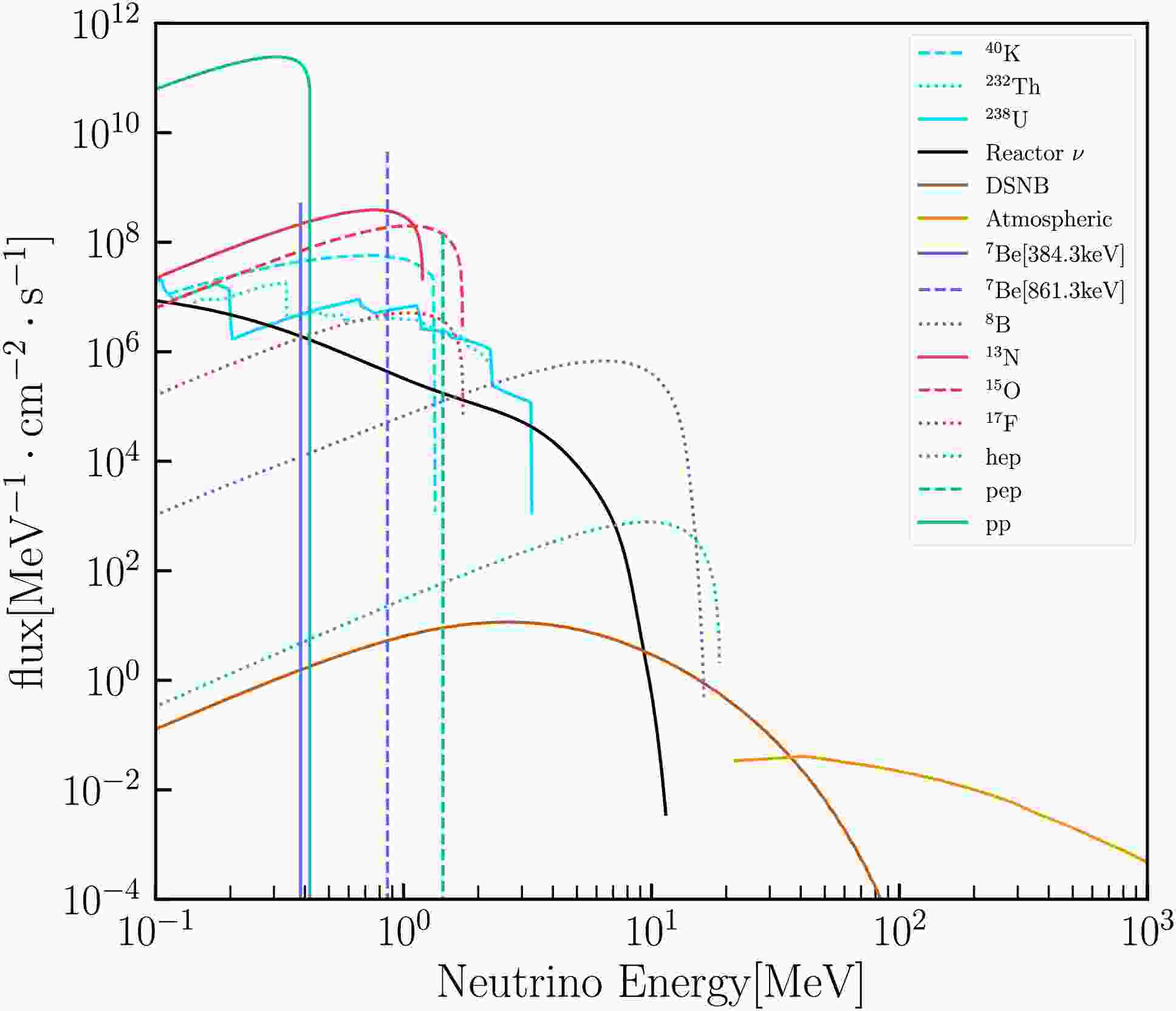 The neutrino fluxes, especially those of atmospheric neutrinos, geoneutrinos, and reactor neutrinos, are highly dependent on geographic location. CJPL is uniquely positioned with several unparalleled features that distinguish it from other sites. It has the thickest overburden, providing exceptional shielding against cosmic rays, and has the lowest reactor neutrino flux owing to its remote location from nuclear power plants [18]. Additionally, CJPL has the largest crustal geoneutrino flux, which is highly advantageous for geoneutrino studies. The laboratory also benefits from the lowest environmental radioactivity, ensuring a cleaner experimental environment, and has the longest solar neutrino path through the Earth, which is particularly beneficial for solar neutrino research. Therefore, the specific geographic and environmental features of CJPL contribute to its specialized neutrino background. Next, we elaborate on the pertinent constituents of the neutrino fluxes at CJPL, which are summarized in Fig. 1.