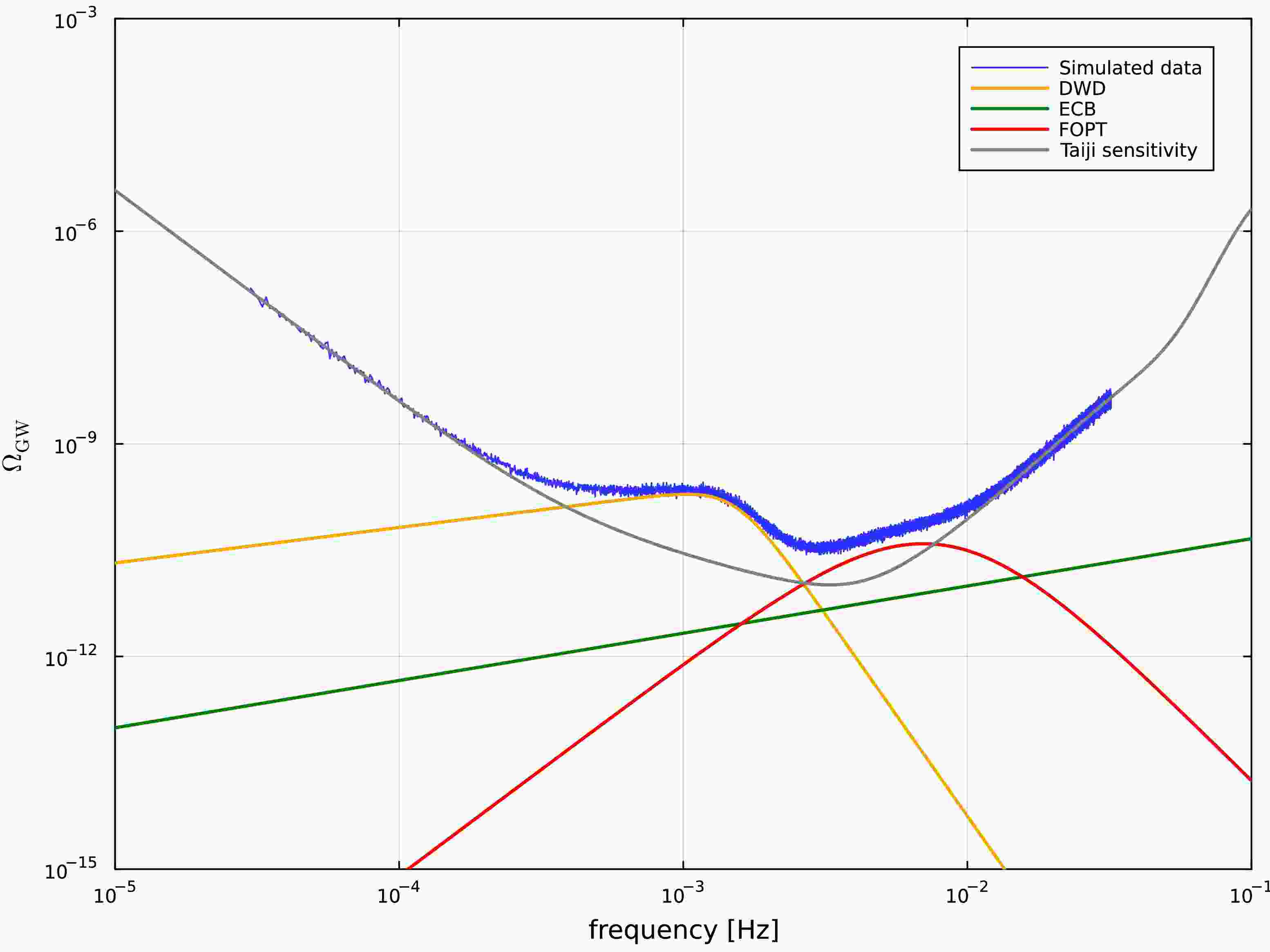 Figure 1.  (color online) Frequency-domain representation of synthetic Taiji A-channel observations (blue). We also show the galactic DWD confusion noise (orange), contribution from ECB (green), and cosmological background from the FOPT (red) with parameters $\Omega_{\mathrm{PT}}=3.9\times 10^{-11}$ and peak frequency $f_{\mathrm{PT}}= 7\times 10^{-3} \mathrm{Hz}$. For reference, the Taiji detector's sensitivity is plotted in terms of $\Omega_{\mathrm{GW}}(f)$ as a gray curve.