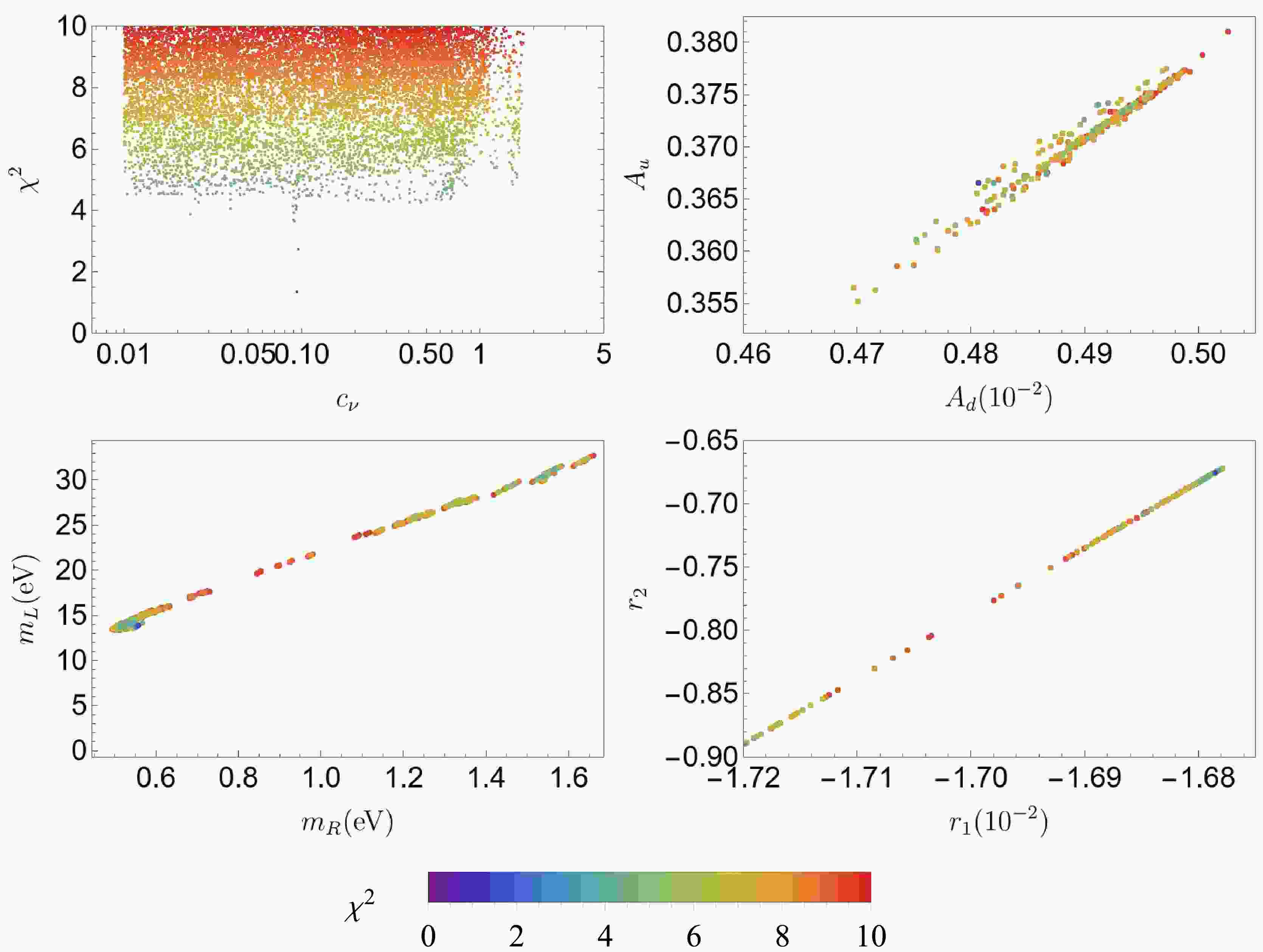 $ \chi^2 $ value on the model parameters as well as correlations among these parameters. Note that$ c_\nu $ varies in the range (0,1.7) and$ \chi^2 $ reaches a minimum of 1.6 when the value of$ c_\nu $ is approximately 0.12 . The benchmark point at the minimum of$ \chi^2 $ is listed in Appendix B.Note also the linear correlation between