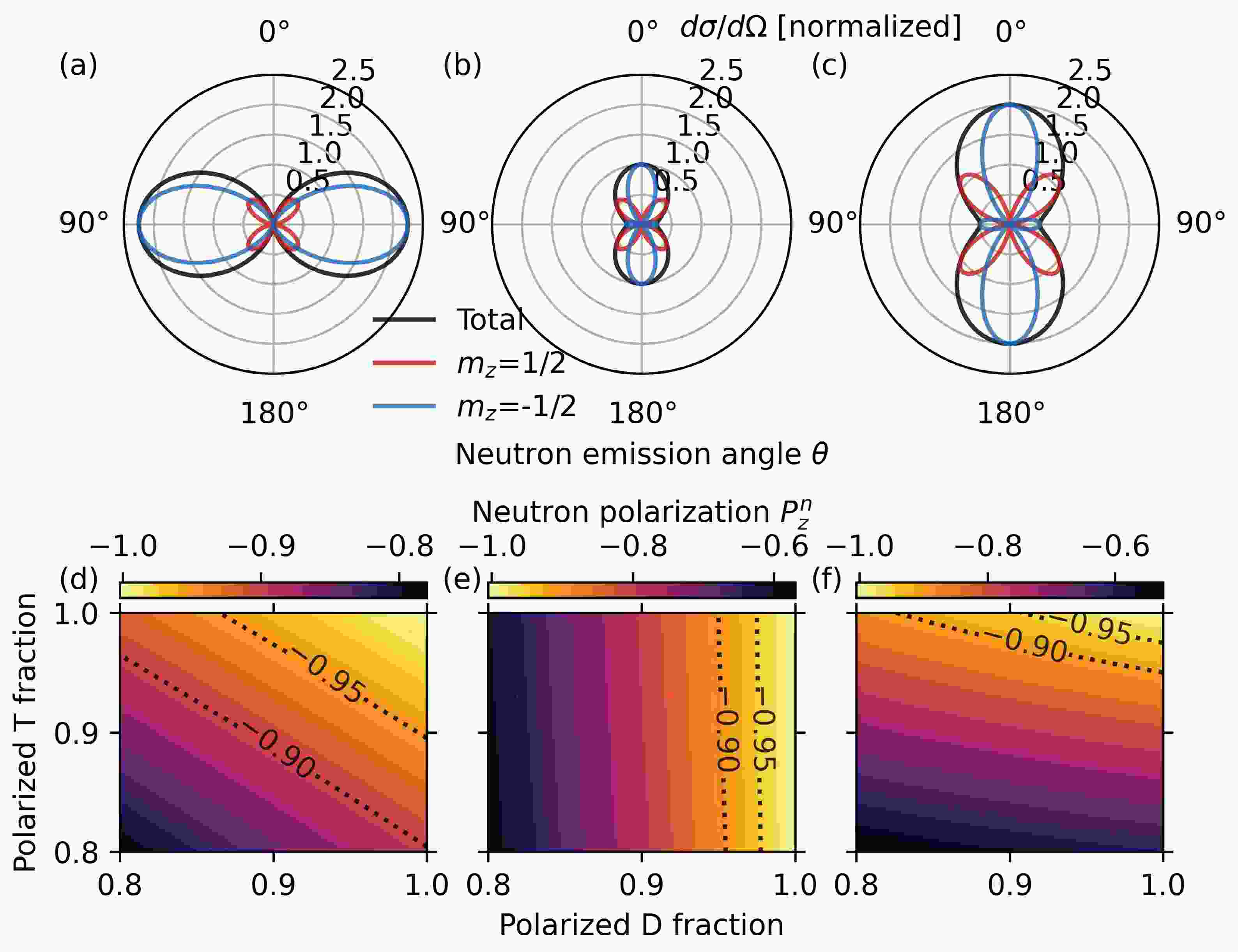 $ m_z=1/2 $ state and D in$ m_z=1 $ state. (b) Differential cross-sections for T in$ m_z=1/2 $ state and D in$ m_z=-1 $ state. (c) Differential cross-sections for T in$ m_z=-1/2 $ state and D in$ m_z=0 $ state. (d) Neutron polarizations at$ \theta=90^\circ $ for different fractions of T in$ m_z=1/2 $ state and D in$ m_z=1 $ state. (e) Neutron polarizations at$ \theta=0^\circ $ for different fractions of T in$ m_z=1/2 $ state and D in$ m_z=-1 $ state. (f) Neutron polarizations at$ \theta=0^\circ $ for different fractions of T in$ m_z=-1/2 $ state and D in$ m_z=0 $ state. The differential cross-sections in (a)−(c) are normalized by the unpolarized total differential cross-section$ \sigma_0/4\pi $ . The fractions of D in the other two states are assumed to be equal in (d)−(f).To measure the path-integrated magnetic field strengths, three quantities are necessary: the total neutron fluence and the neutron fluences in one of the spin eigenstates with and without the magnetic field. These quantities vary from shot to shot, so single-shot measurements are required. In the case of parallel polarization, the polarized neutrons are emitted mostly at