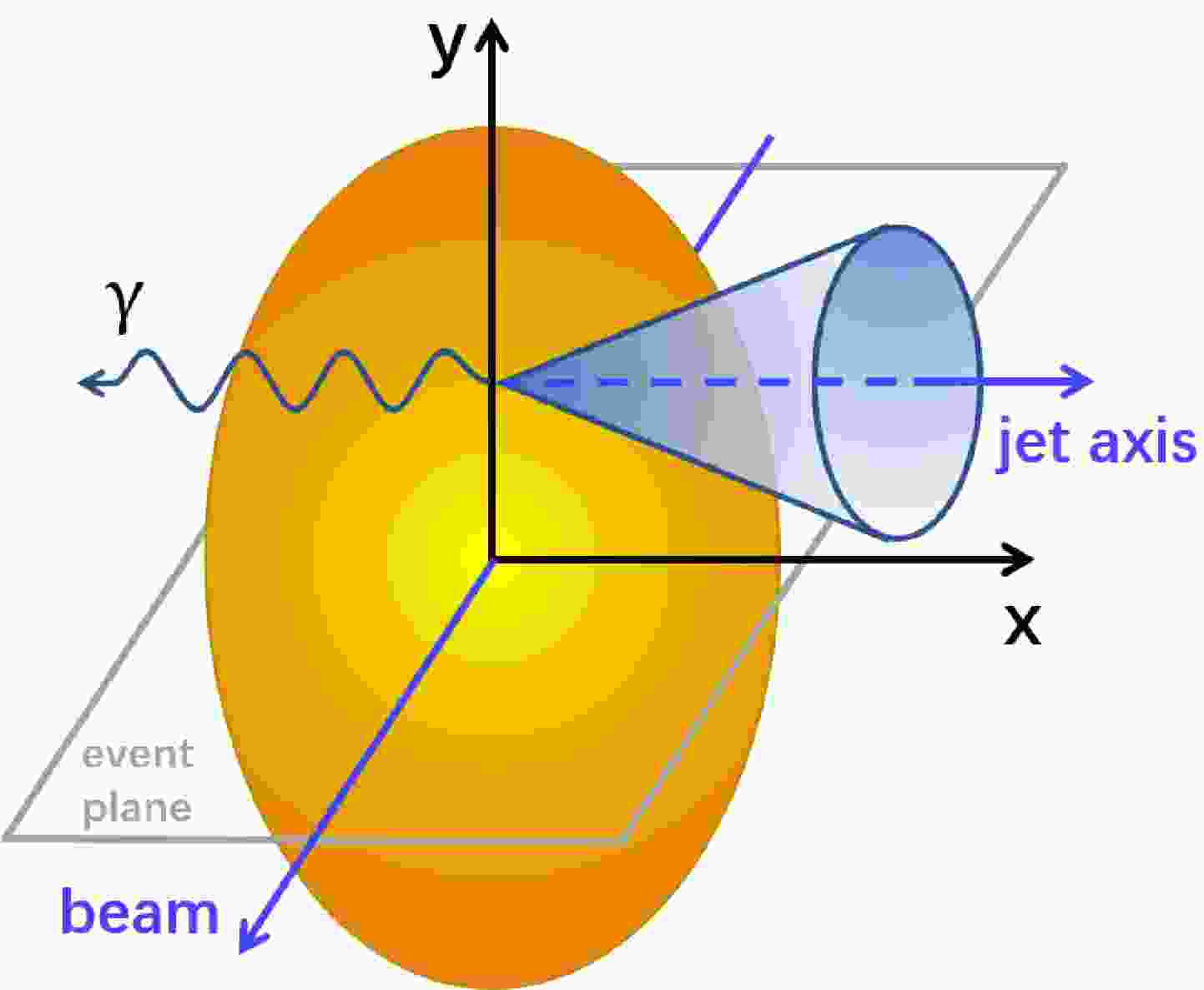 $ p_T^\gamma> $ 60 GeV/c of γ-jet events in Pb+Pb collisions at$ \sqrt{s_{NN}} = 5.02 $ TeV and Xe+Xe collisions at$ \sqrt{s_{NN}} = 5.44 $ TeV. The cone size of the γ-triggered jets is set as$ R=0.3 $ , and the lower threshold of transverse momentum for the jets is set at$ p_T^{\rm jet} > 30 $ GeV/c, with associated partons selected with$ p_T^{\rm assoc}>1 $ GeV/c. The pseudorapidities for the γ-jets are constrained within$ |\eta_{\gamma}|<1.44 $ and$ |\eta_{\rm jet}|<1.6 $ , and their azimuthal angle differences$ |\Delta\phi_{j\gamma}| $ are restricted to be larger than$ (7/8)\pi $ . Fig. 1 shows the illustration of the γ-jet configuration relative to the event plane. In all our calculations for Pb+Pb and Xe+Xe collisions, we assume that the event plane is oriented along the x-axis. The wavy arrow pointing toward the negative x-direction denotes the selected trigger photon direction, which lies parallel to the event plane. Correspondingly, the associated jet is approximately aligned along the positive x-axis, as illustrated by the cone in Fig. 1. On the one hand, unifying the initial directions of the jets can prevent the values of$ A_N^{\boldsymbol{n}} $ from being averaged out statistically, which is crucial for the calculation of$ A_N^{\boldsymbol{n}} $ . On the other hand, constraining the initial directions of the jets helps us better regulate the paths of jet propagation through the QGP. This enables us to study the jet quenching effect relying on the propagation path more directly. -