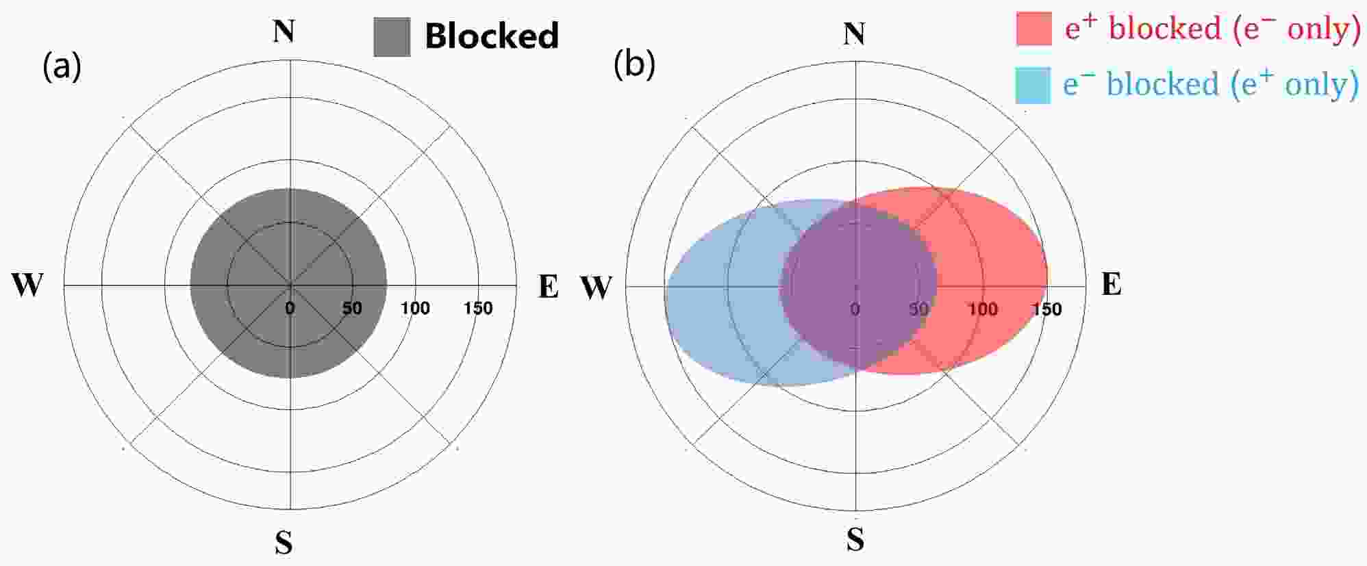 The Earth's magnetic field (geomagnetic field) extends from its interior into space. The magnitude of the geomagnetic field at the surface of the Earth ranges from 25 μT to 65 μT [22], and significantly affects the distributions of CRs in near-Earth space. In particular, positively charged particles with low energy from the east are suppressed compared with those from the west and vice versa [23−25]. This effect, also known as the east-west effect, makes it possible for DAMPE to separate CR electrons and positrons. The black shaded band in Fig. 1(a) shows the angular distribution of CRs blocked by the Earth without the geomagnetic field. Furthermore, the blocked distributions of CR electrons and positrons are distorted by the geomagnetic field to the opposite direction as shown in Fig. 1(b). Electron trajectories falling within the angular distribution represented by the blue shaded band are blocked by the Earth (“positron-only” region), whereas in the case of the red shaded band, the positron trajectories are blocked (“electron-only” region).
