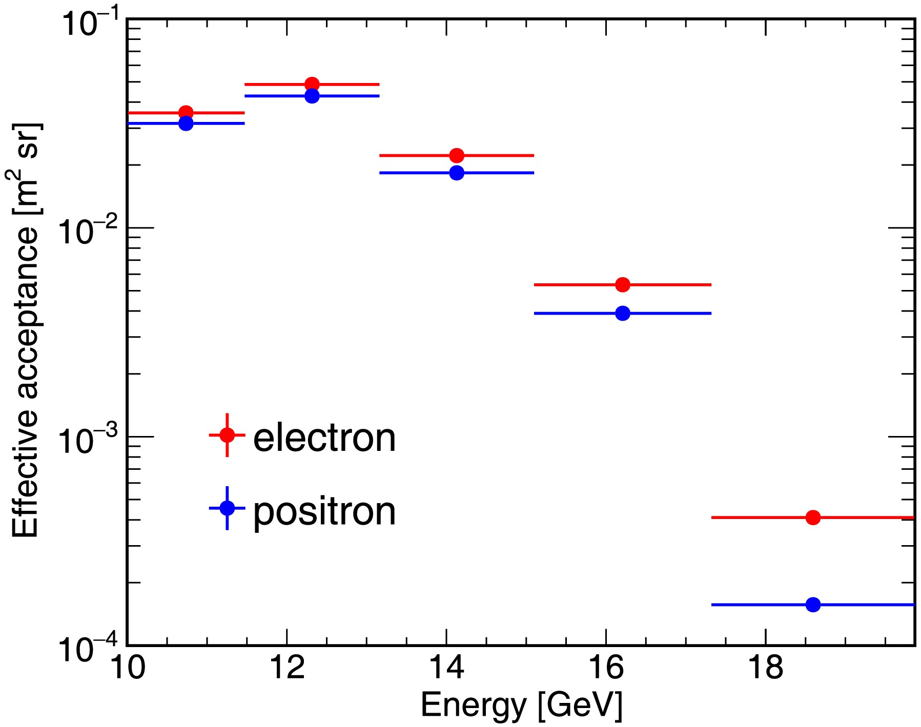 Figure 3. (color online) Effective acceptance of CR electrons and positrons as a function of the kinetic energy, derived from MC simulations. The difference in the effective acceptance of electrons and positrons originates from the asymmetry of the geomagnetic field, which causes the size of the ''electron-only'' region to be different from that of the ''positron-only'' region. Therefore, the region selection efficiency of positrons differs from that of electrons.