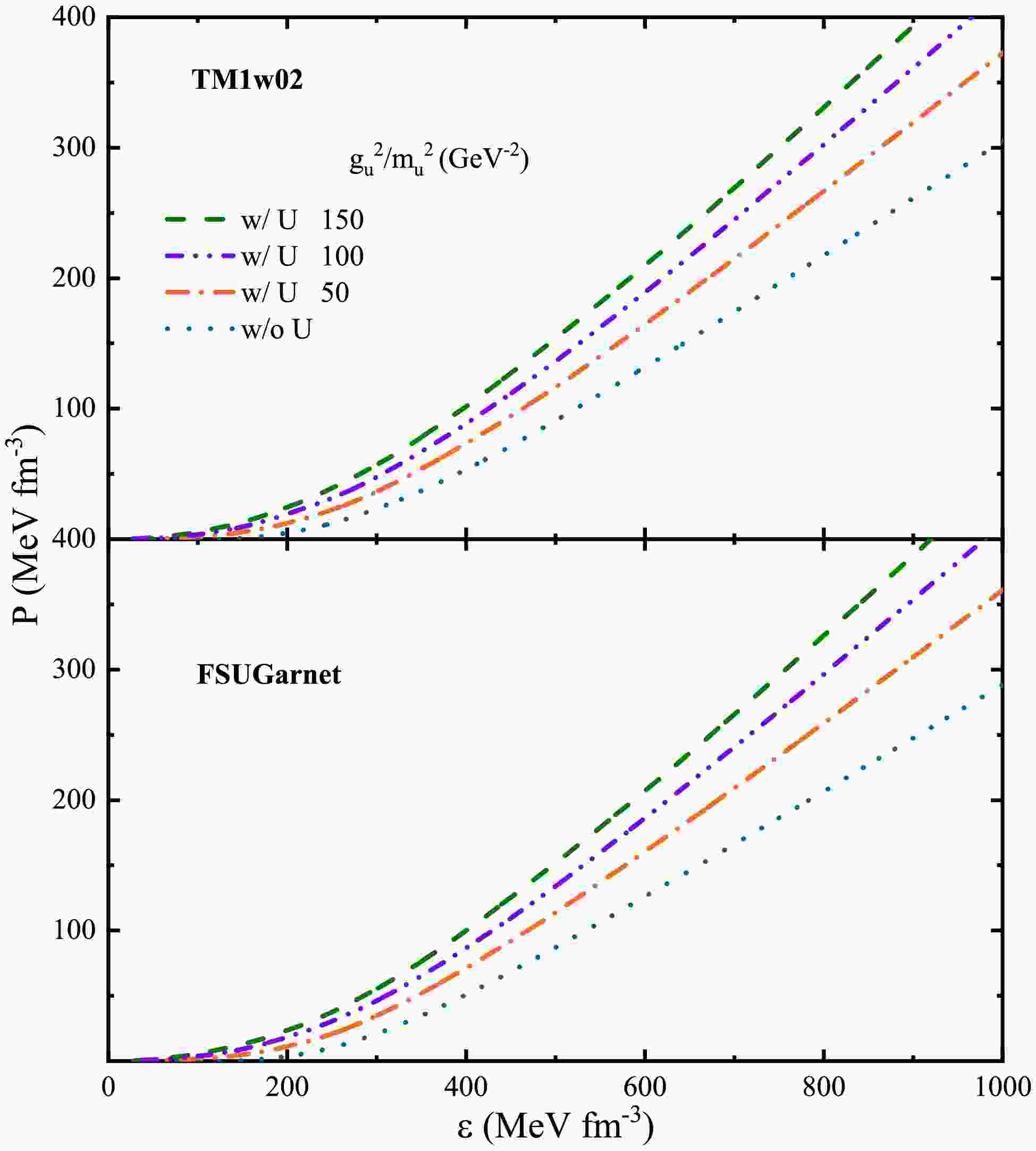 $ g_u^2/m_u^2 $ . In the RMF approximation, the contribution of the U boson is determined linearly by the ratio of the coupling constant to its mass, i.e.,$ g_u/m_u $ , as seen in Eqs. (5) and (6). The actual values of$ g_u $ and$ m_u $ lack sufficient constraints and are largely uncertain. As argued by Krivoruchenko et al. [17],$ m_u\leq30 $ MeV and the$ g_u^2/m_u^2 $ value of the U boson should be less than about 300 GeV-2, which roughly corresponds to the value of the ordinary vector$ \omega $ meson. To escape detection in terrestrial measurements on nuclei, it was pointed out that the mass of the weakly coupled U boson is on the order of 1 MeV [20]. In this work, the ratio is chosen to be beneath 300 GeV-2. It is observed that the inclusion of the U boson can significantly stiffen the nuclear EOS with the TM1w02 and FSUGarnet. This is physically evident since the vector U boson provides additional repulsion in addition to the vector mesons.