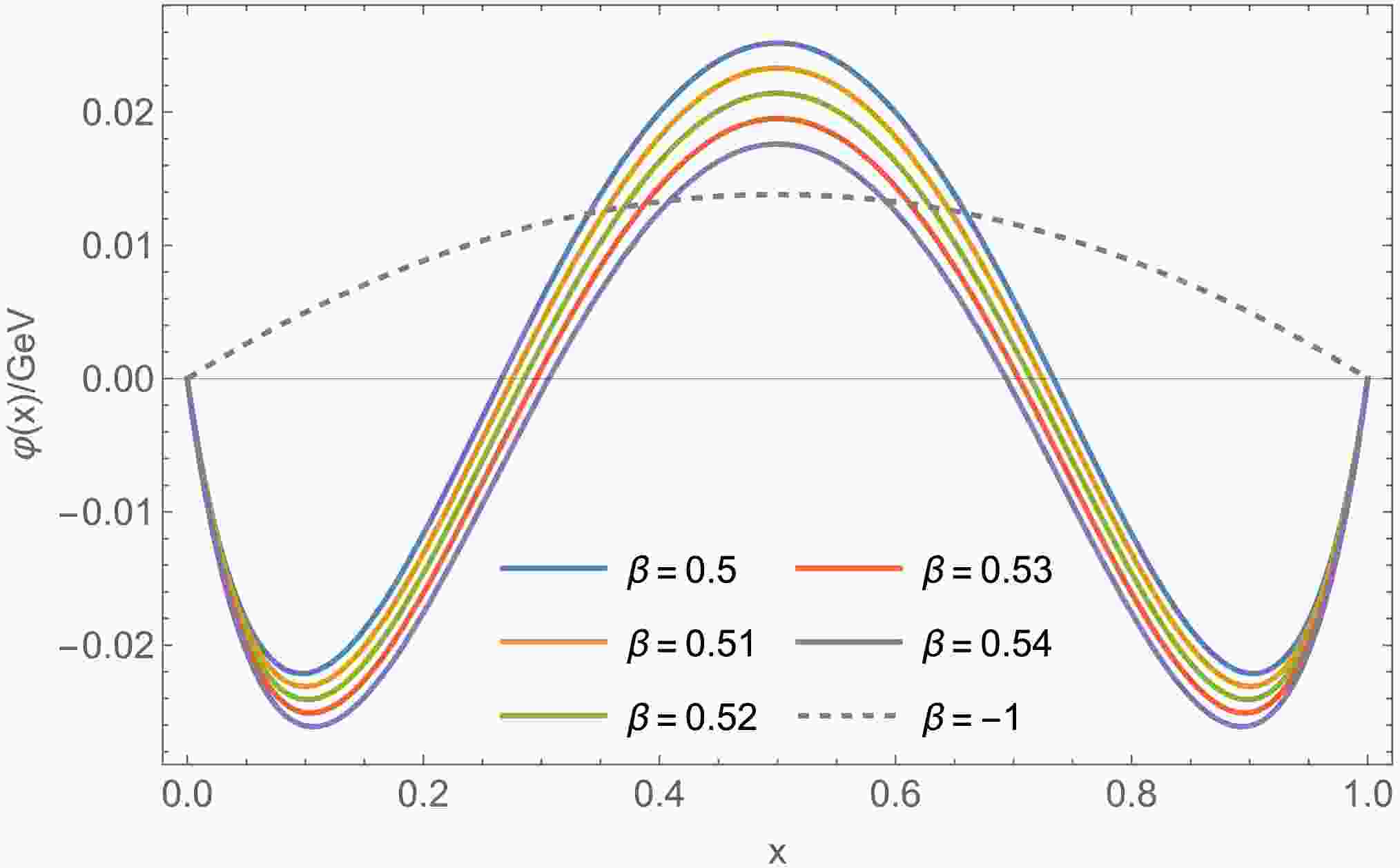 Figure 1 illustrates the general properties of the first excited state DA [27, 28], which, in our model, is entirely attributed to the presence of a node in the BS amplitude. The symmetry is natural because we have assumed isospin symmetry. Like the ground state, the maximum occurs at $ x=1/2 $, and as x increases, the value changes from positive to negative. The position of the node is related to the size of beta (which suggests it is connected to the node position of the BS amplitude). As x approaches 1, the DA tends to zero with a $ (1-x)^1 $ power law from below. This behavior arises partly because we have defined the decay constant as negative, and partly because the BS amplitude exhibits a $ 1/k^{2} $ behavior at large momentum.