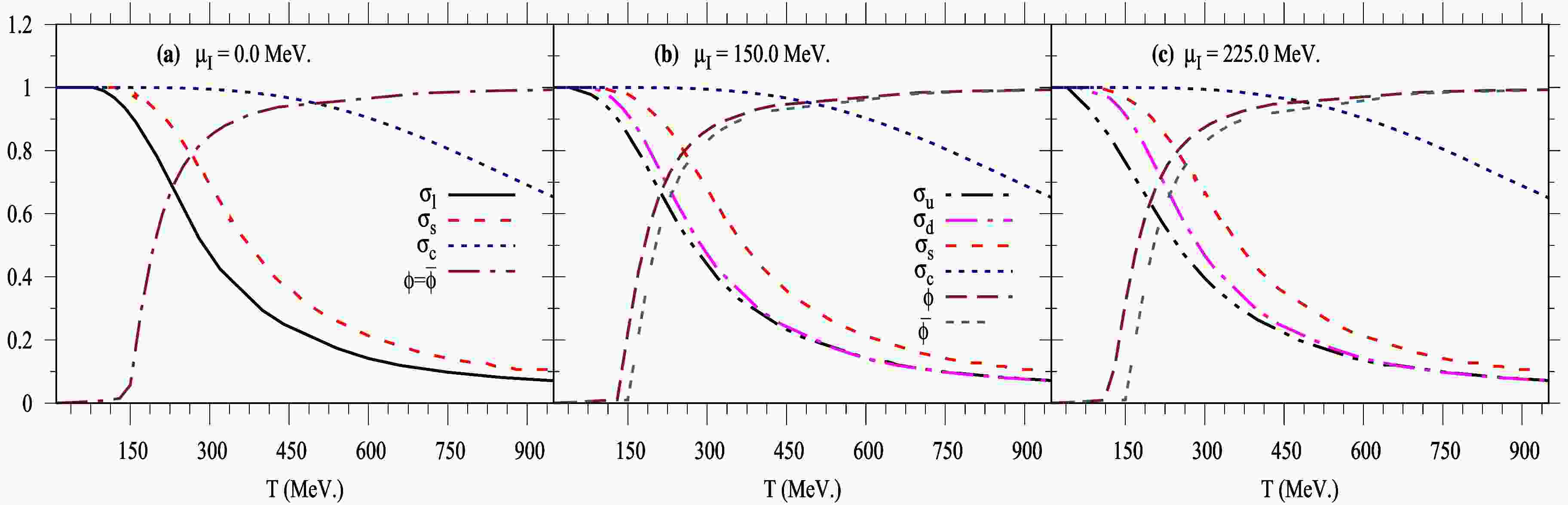 • The SU($ N_f $) PQM model addresses the phase transition between the confinement and deconfinement phases. The chiral Lagrangian is incorporated with the Polyakov-loop potential as $ {\cal{L}}_{{\rm{PQM}}} = {\cal{L}}_{{\rm{chiral}}} - {\cal{U}}(\phi, \bar{\phi}, T) $. The chiral Lagrangian $ {\cal{L}}_{{\rm{chiral}}} $ for ($ N_f=4 $) quark flavors and ($ N_c = 3 $) color degree of freedom is given as follows: