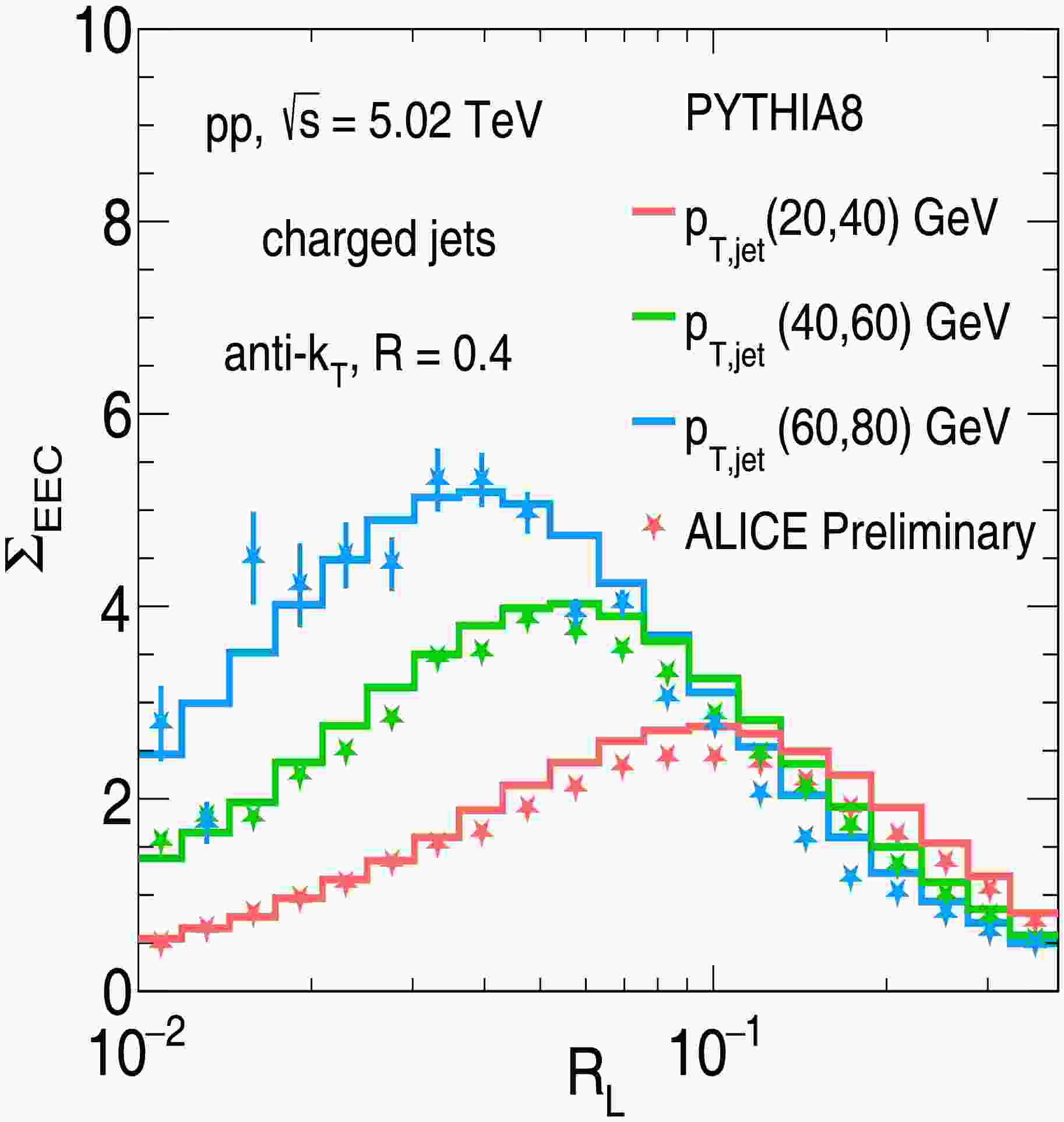 Figure 1.  (color online) PYTHIA8 simulation results of defined $ \Sigma_{\text{EEC}} $ distributions as functions of $ R_{{\rm{L}}} $ for inclusive charged jets with a jet size of $ R=0.4 $ in three jet transverse momentum intervals: $ 20 \ {{\rm{GeV}}} <p_{\rm T, {\rm{jet}}}<40 $ GeV, $ 40 \ {{\rm{GeV}}} < $$ p_{\rm T, {\rm{jet}}}<60 $ GeV and $ 60 \ {{\rm{GeV}}} <p_{\rm T, {\rm{jet}}}<80 $ GeV produced in $\rm p+p$ collisions at $ \sqrt{s}=5.02 $ TeV. The results are compared with the ALICE experimental data [94].